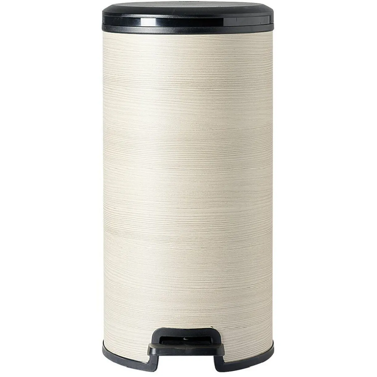 Poubelle ronde à pédale en plastique aspect bois, d’une contenance de 30 L.