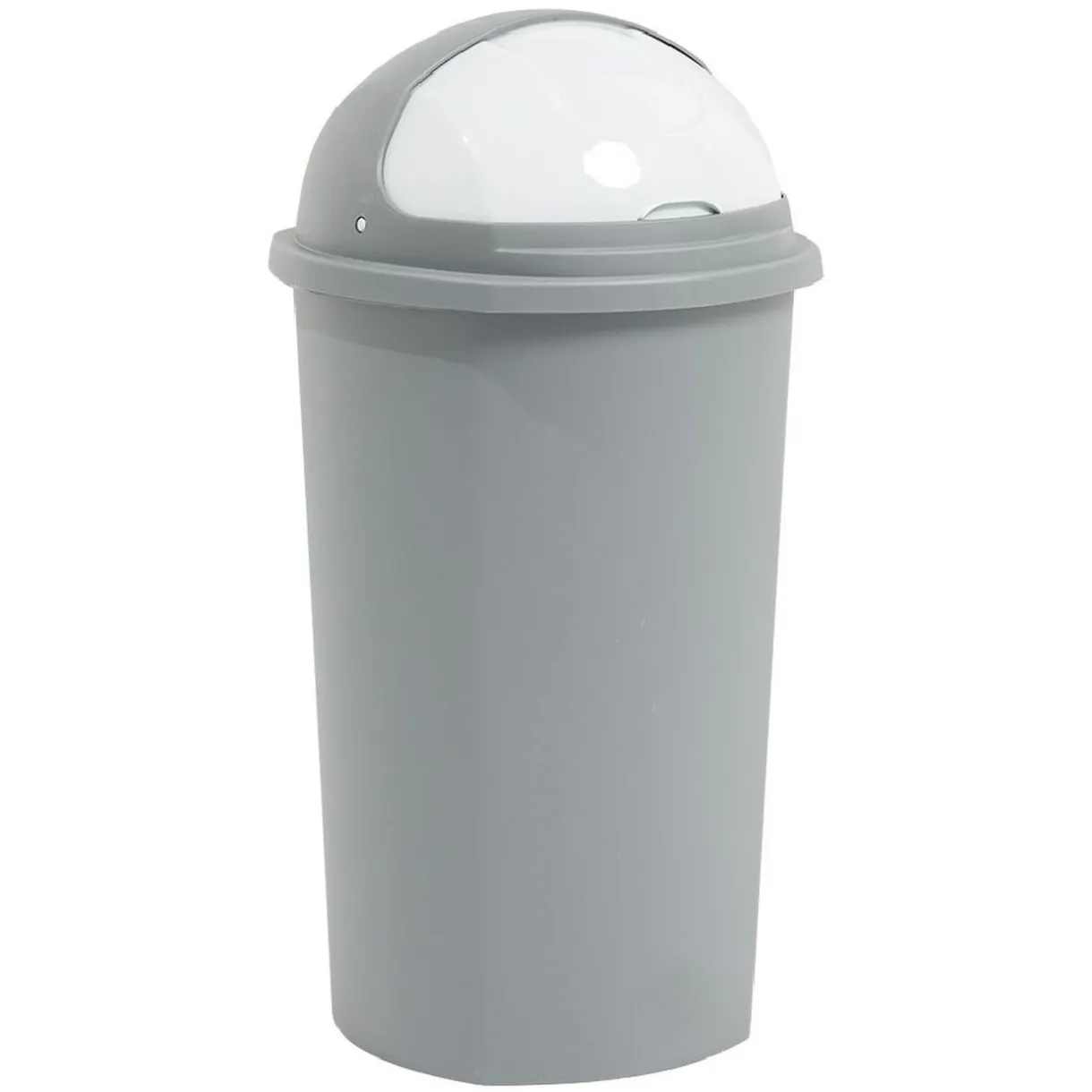 Poubelle à rabat de couleur grise d’une contenance de 50 litres. D’un design neutre, elle s’intégrera facilement à votre pièce.