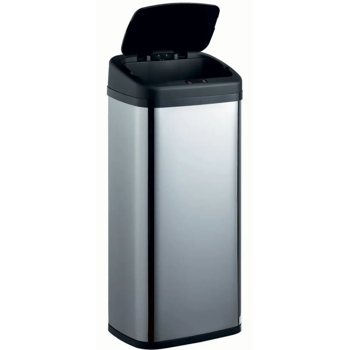 Poubelle grise et noire avec système automatique et infrarouge qui détecte le passage de votre main et s’ouvre instantanément.