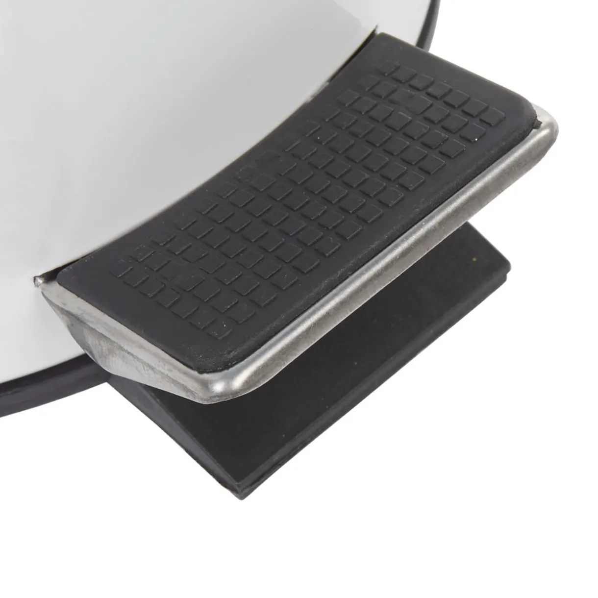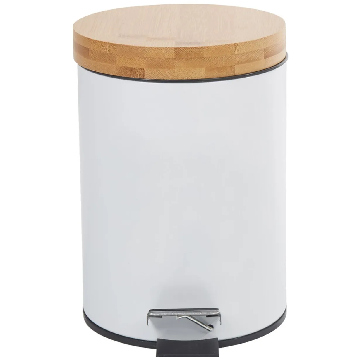 Poubelle de salle de bain en métal blanc avec couvercle en bambou marron.