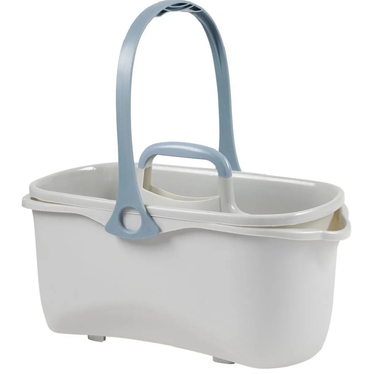 Seau de ménage gris d’une contenance de 11 litres avec anse bleue. Pratique, un panier est fourni avec afin d’être plus facilement mobile lors du transport de vos produits d’entretien.