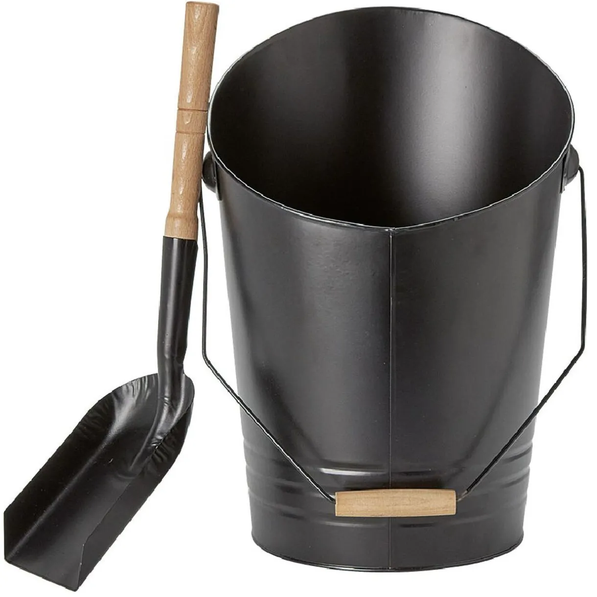 Seau à cendres avec pelle en acier noir finition bois pour le nettoyage de votre cheminée, poêle ou barbecue.