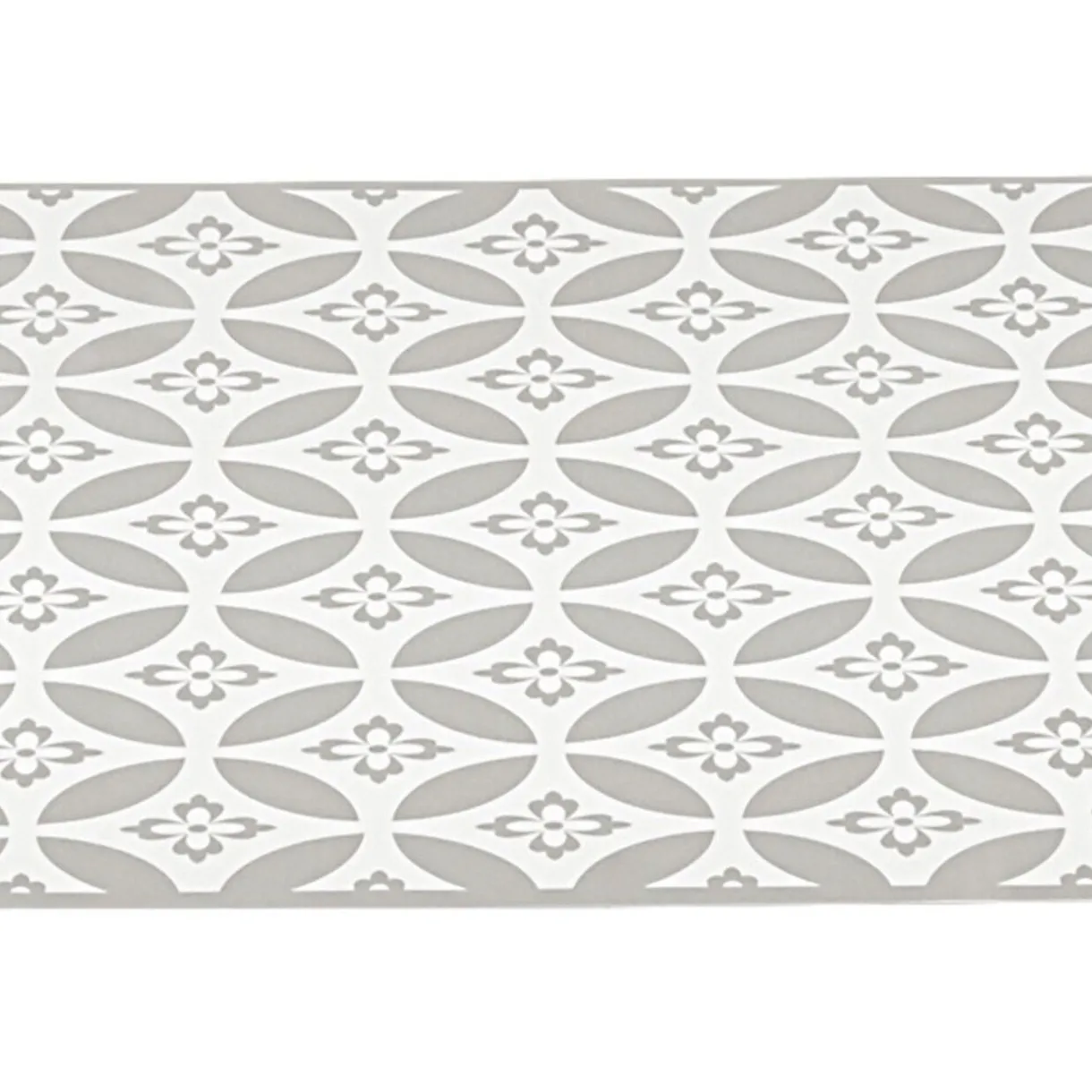 Tapis de cuisine en vinyle rectangulaire imprimé rosace blanc et gris.