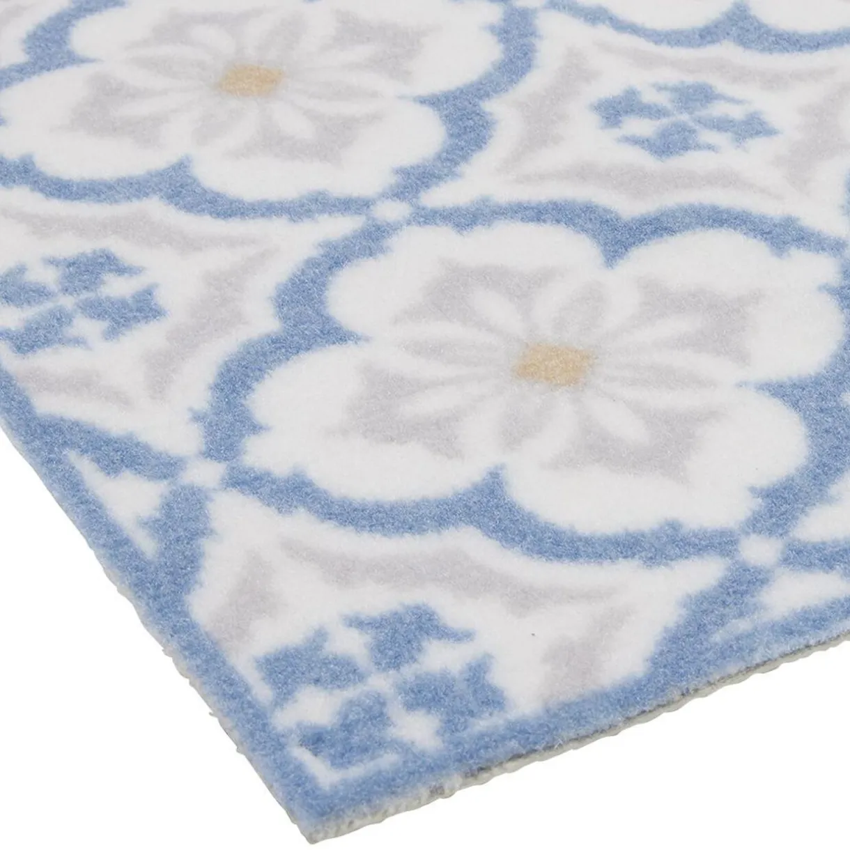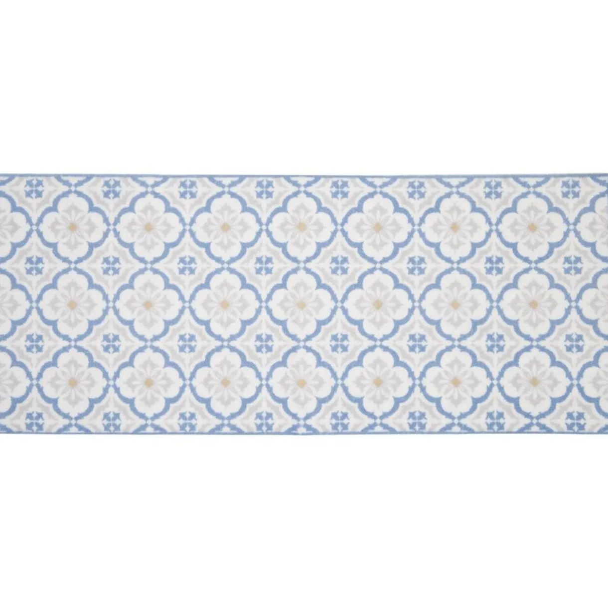 Tapis de cuisine rectangulaire avec imprimé carreaux de ciment bleu et blanc. Antidérapant et absorbant, il tiendra son rôle à merveille en plus d’être facile d’entretien.
