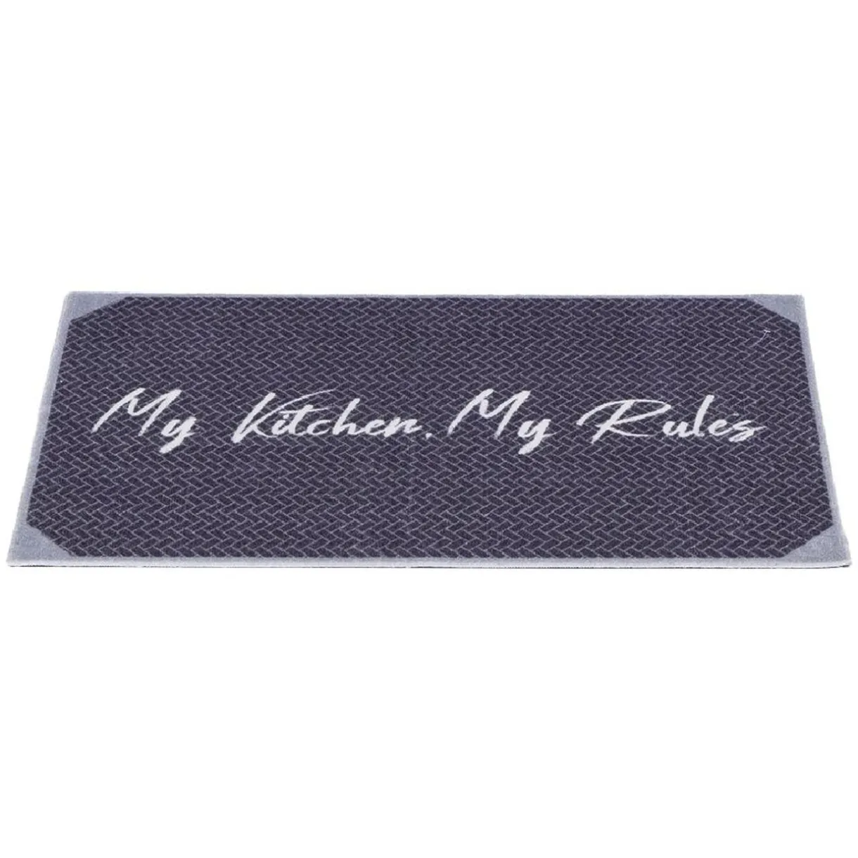 Apportez une touche déco à votre cuisine avec ce tapis de couleur grise et inscription blanche « My Kitchen. My Rules ».