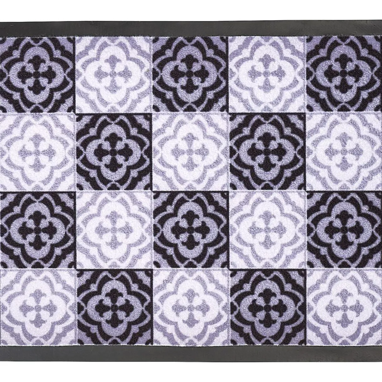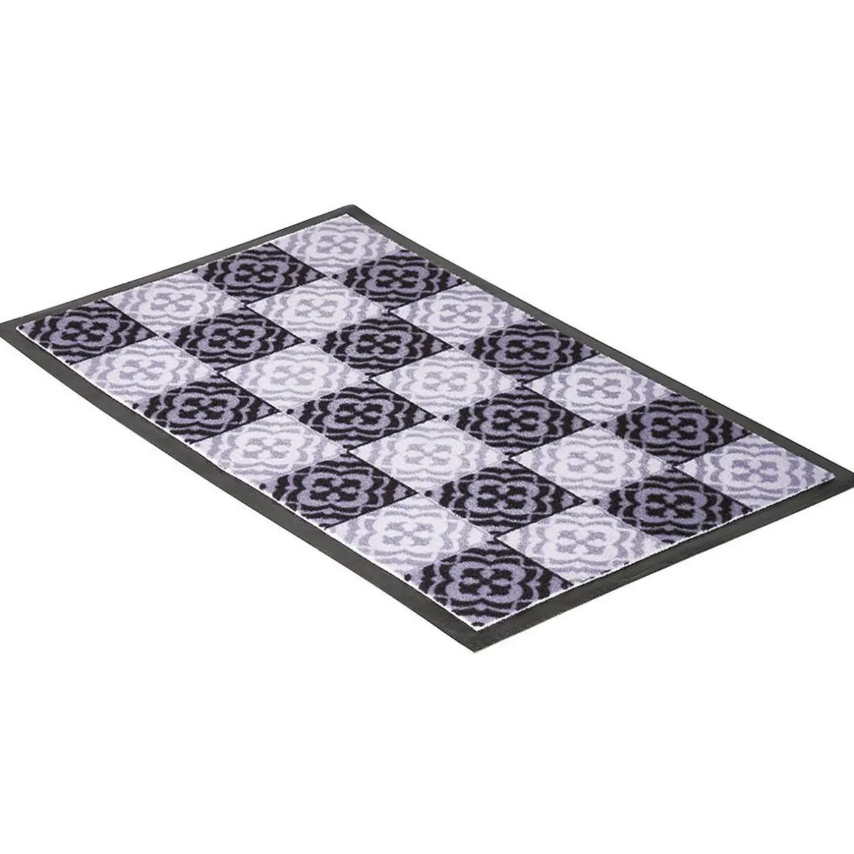 Tapis d’entrée antipoussière de forme rectangulaire avec motifs carreaux de ciment noirs et blancs.