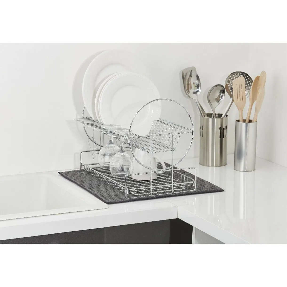 Laissez s’égoutter votre vaisselle en la posant directement sur le tapis ou sur un égouttoir installé dessus !