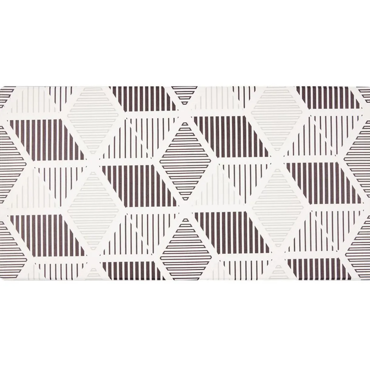 Tapis rectangulaire avec imprimé géométrique noir et blanc. Idéal dans votre cuisine ou buanderie, avec sa matière vinyle il est très facile d’entretien.