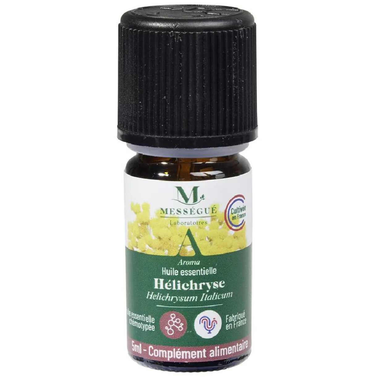 Huile essentielle d’hélichryse dans son flacon en verre ambré avec compte-gouttes et sécurité enfant.