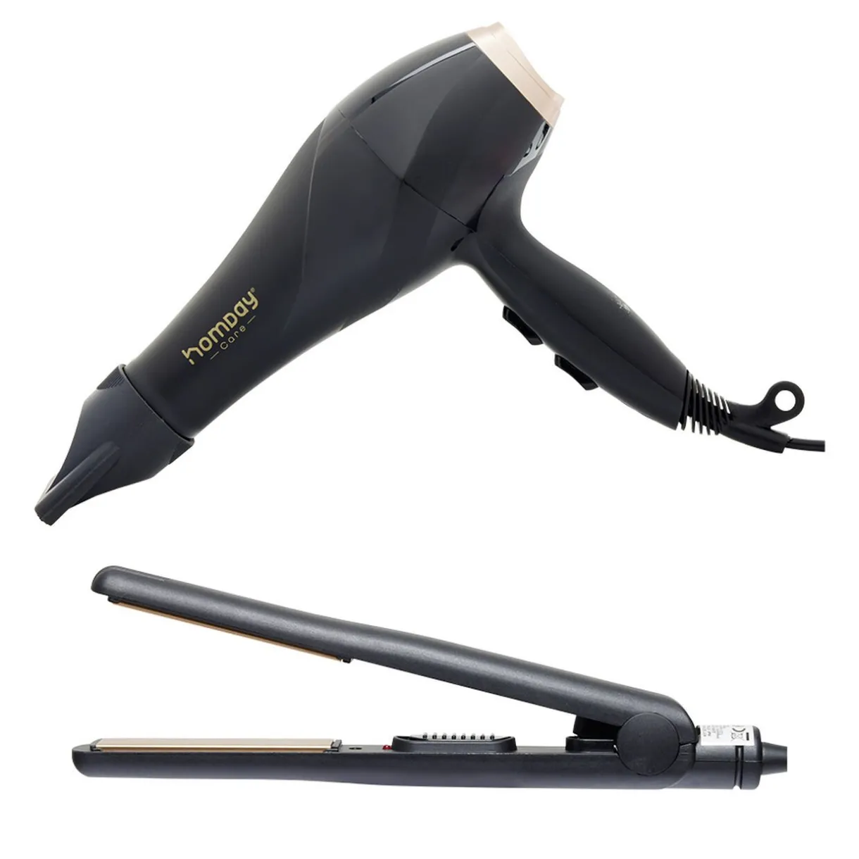 Lot d’un lisseur et sèche cheveux de couleur noire, pour une coiffure impeccable tout au long de la journée.