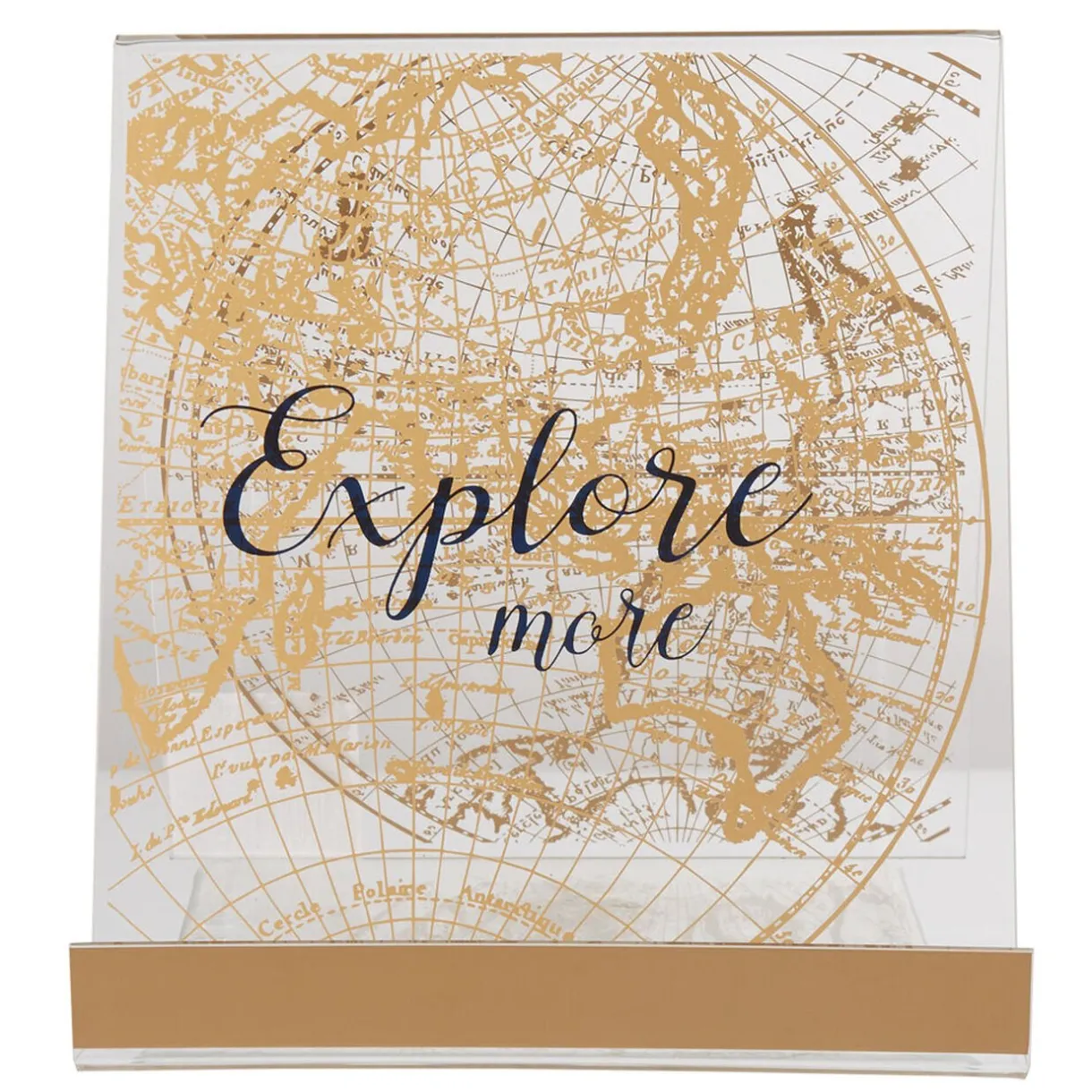 Porte tablette transparent imprimé globe doré.