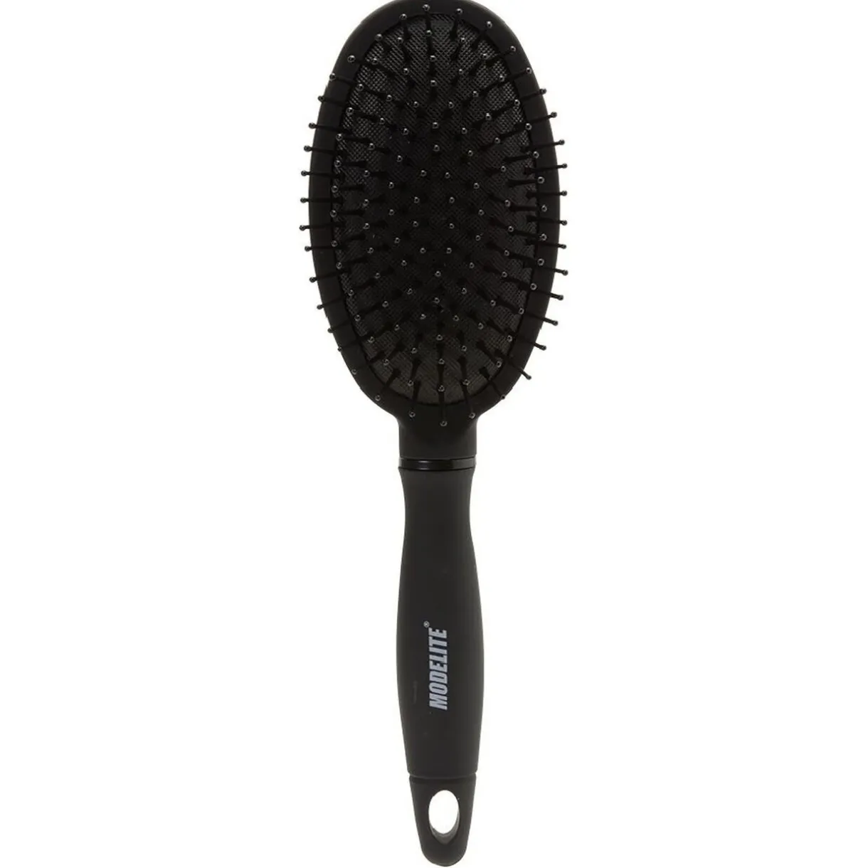 Brosse pneumatique ovale avec picots en pvc noir perlés. Idéale pour masser délicatement le cuir chevelu lors du démêlage et du coiffage.