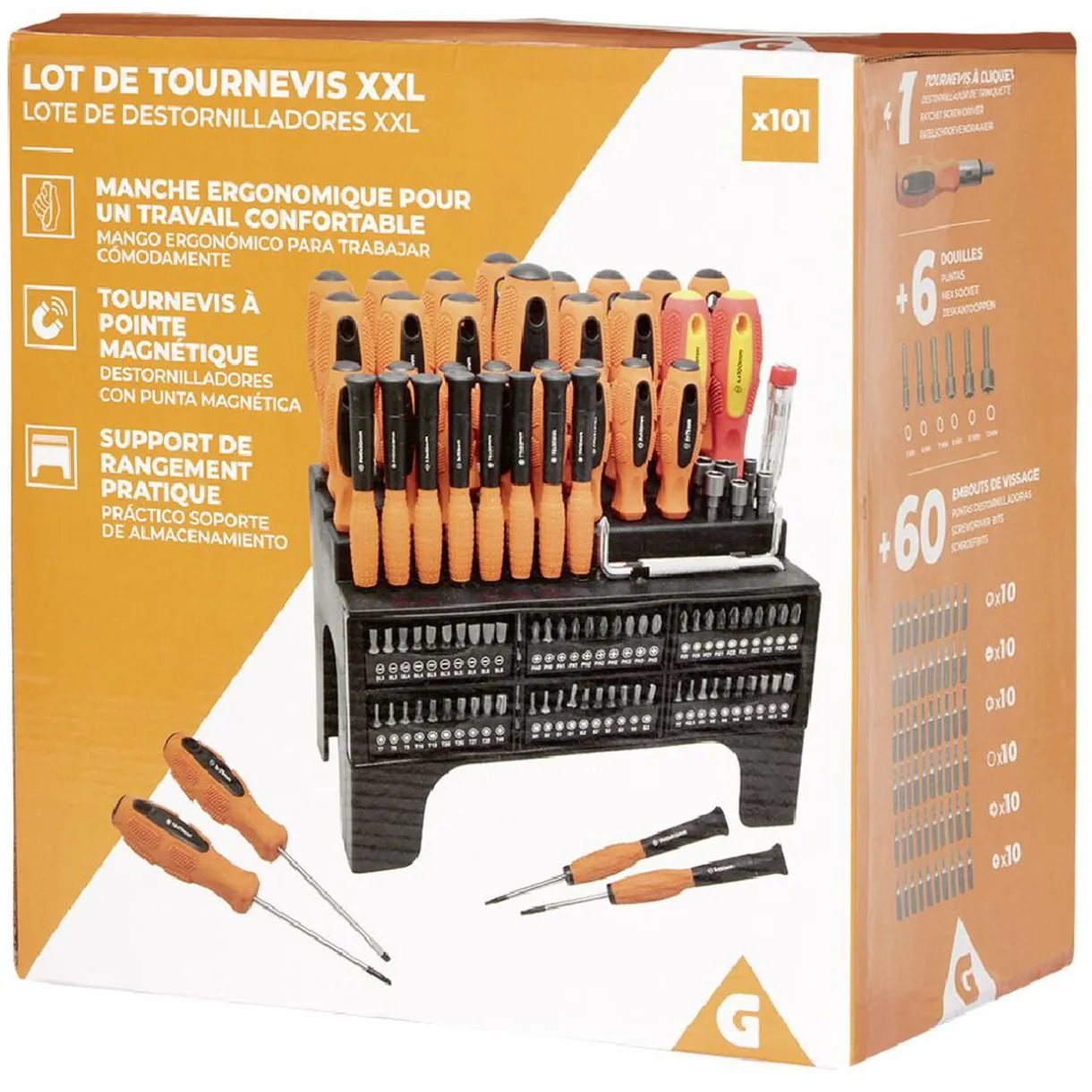 Lot de tournevis avec embouts comprenant 101 pièces avec manches ergonomiques et pointes magnétiques pour une bonne prise en main et un travail confortable.
