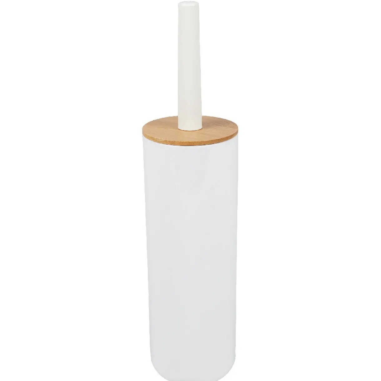Brosse WC blanche de forme cylindrique en plastique avec couvercle de couleur naturel en bambou.