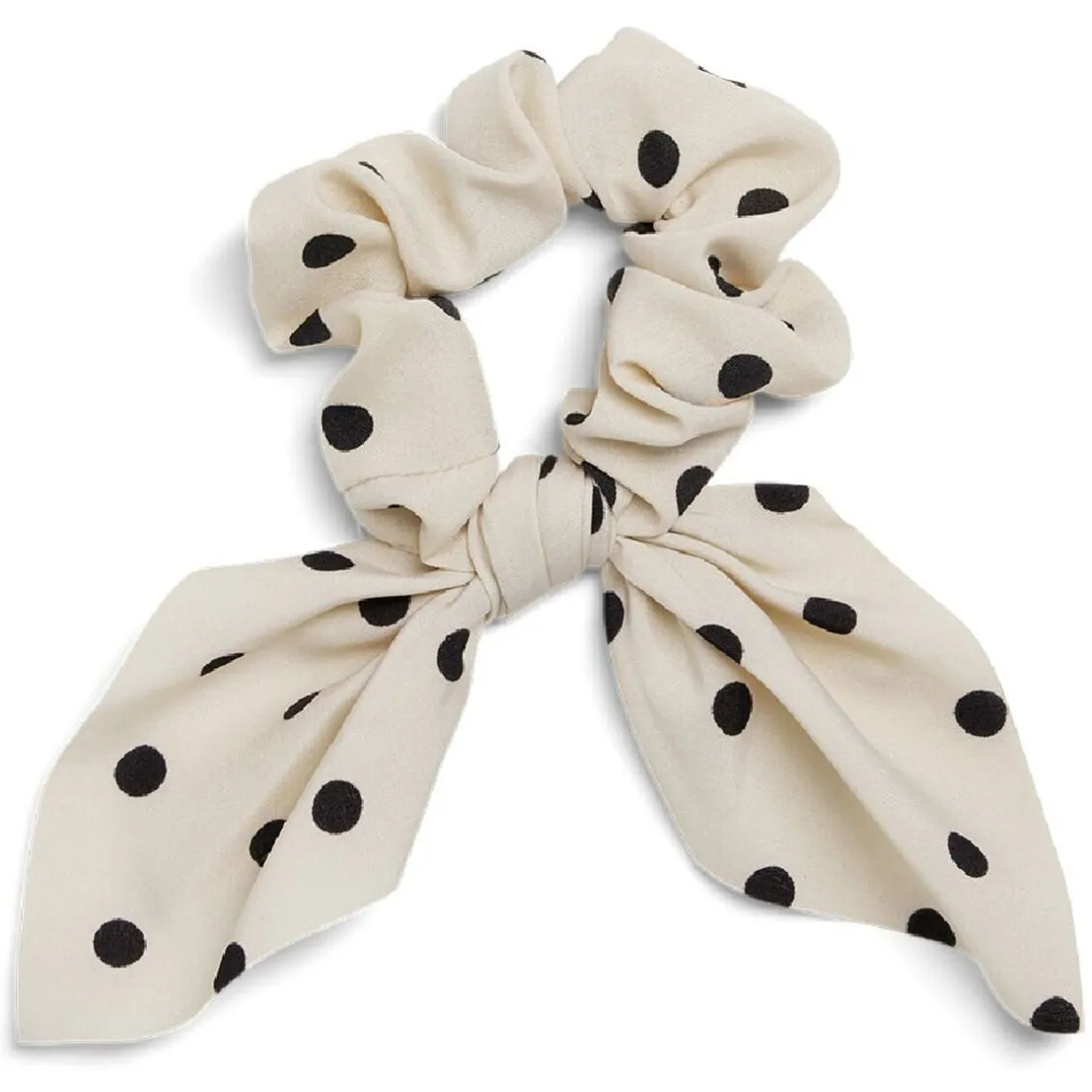 Ajoutez une touche de charme à vos coiffures avec ce chouchou foulard beige à pois noirs.