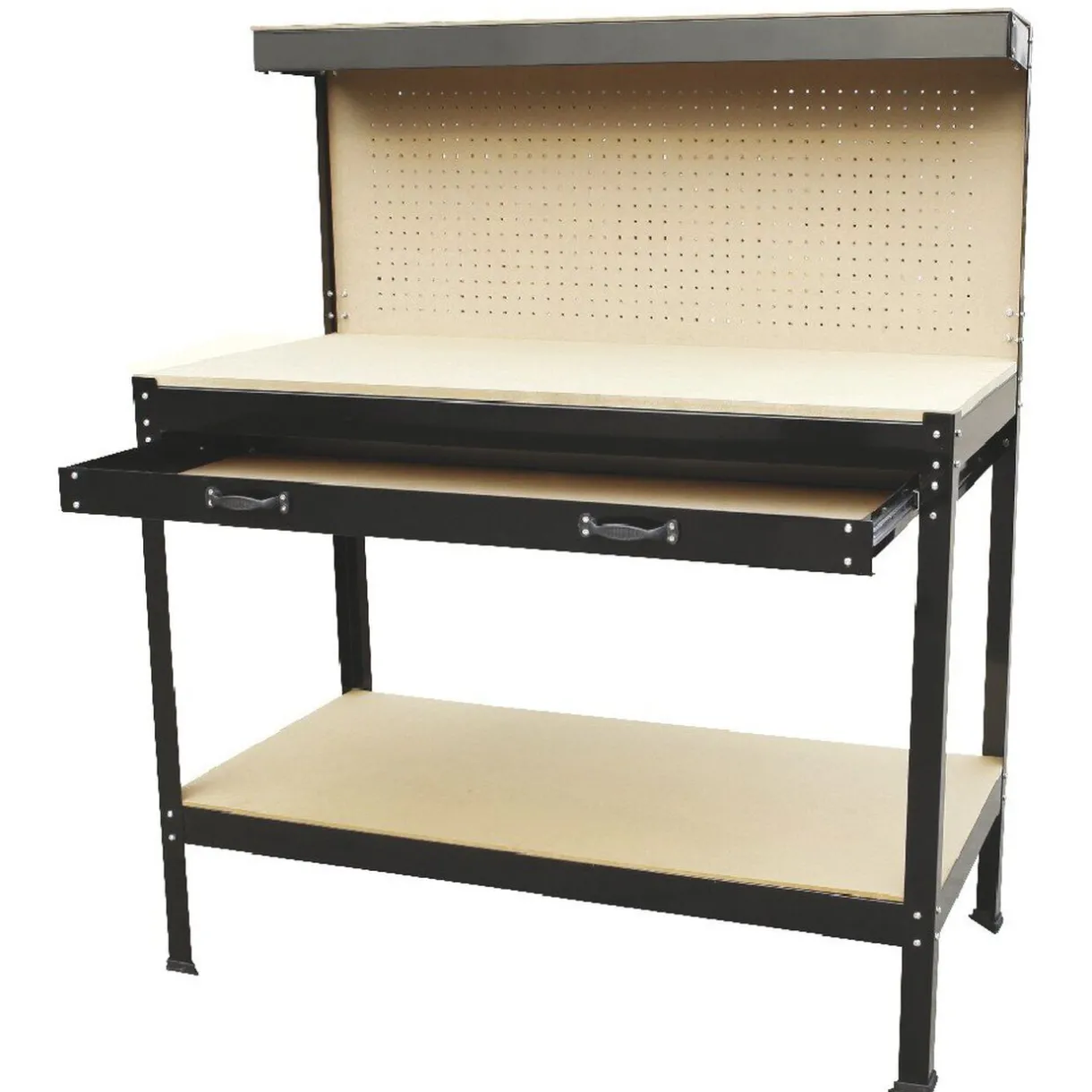 Etabli d’atelier en métal avec panneau supérieur perforé, 1 grand tiroir et 20 crochets inclus.