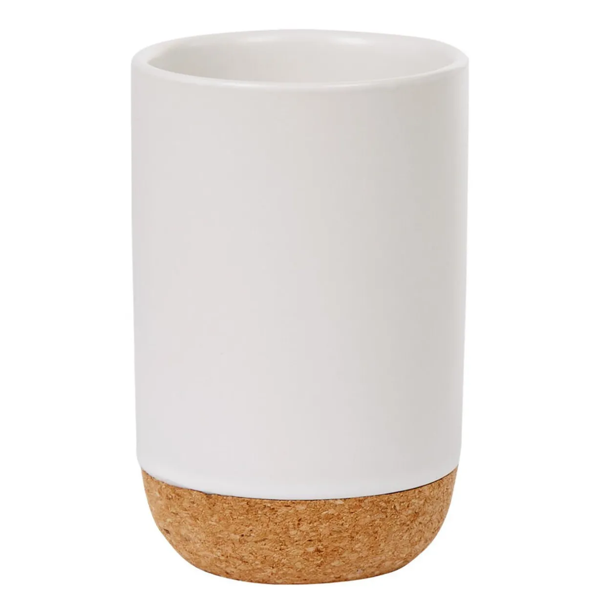 Gobelet pour salle de bain en plastique blanc avec socle en liège naturel.