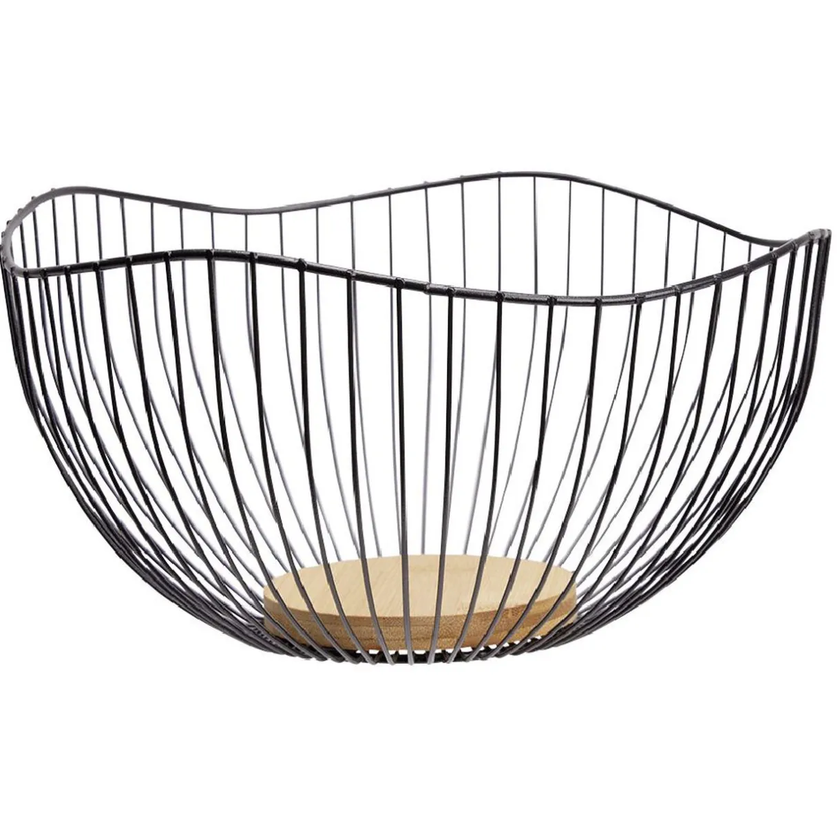 Panière à fruits design en métal filaire noir avec fond en bambou naturel.