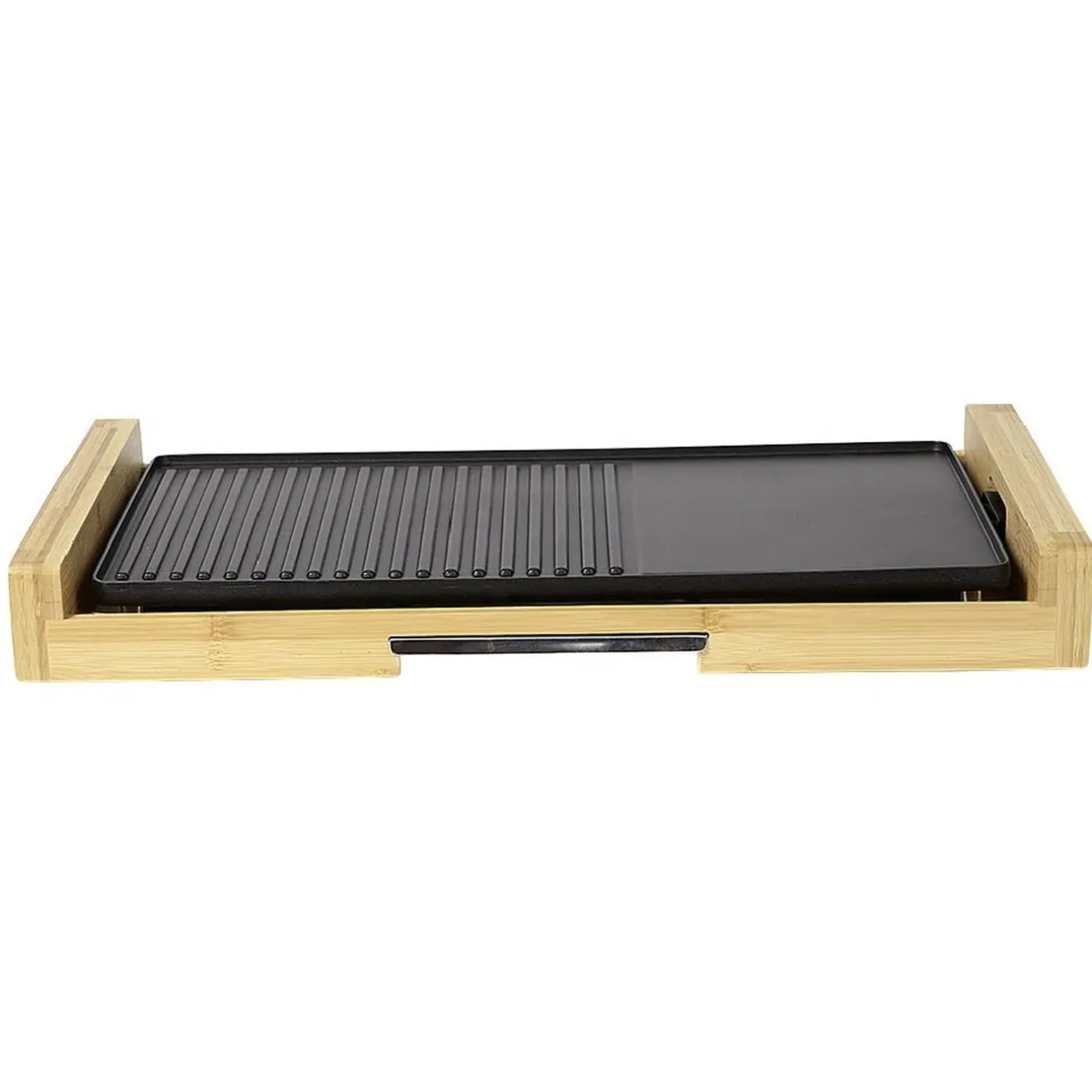 Plancha grill en bambou avec thermostat réglable et plaque de cuisson détachable.