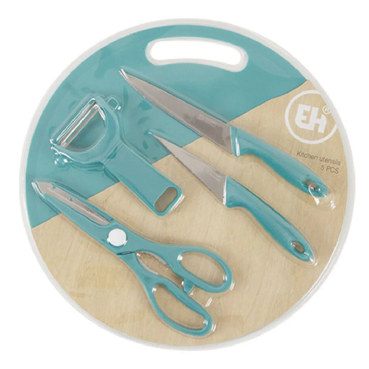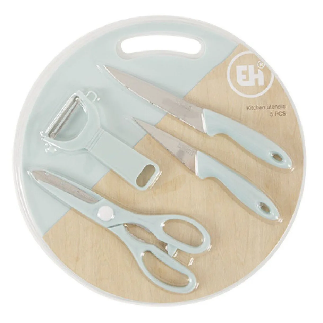 Contient une planche à découper + un ciseau + un éplucheur + 2 couteauxCe produit existe en 3 modèles/coloris, modèle aléatoire selon disponibilité en magasin- Couleur : Blanc / Bleu / Noir- Dimensions : D31,7 x H3cm- Matière(s) : Inox