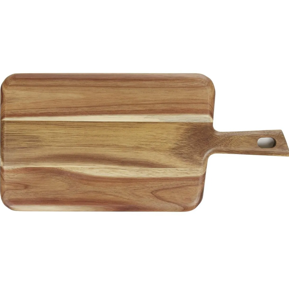 Planche à découper en bois d’acacia marron avec long manche percé. Avec sa forme élégante et originale, cette planche vous servira aussi bien pour la coupe de vos légumes que comme plat de présentation.