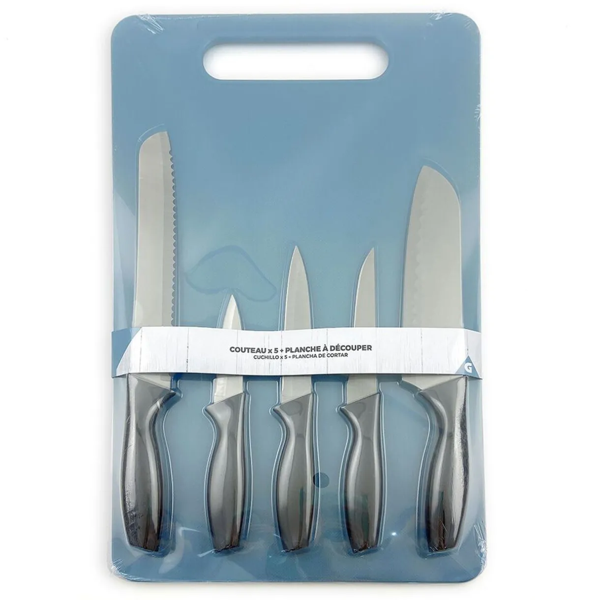 Soyez équipé pour couper tous vos aliments avec cette planche et ses 5 couteaux :
