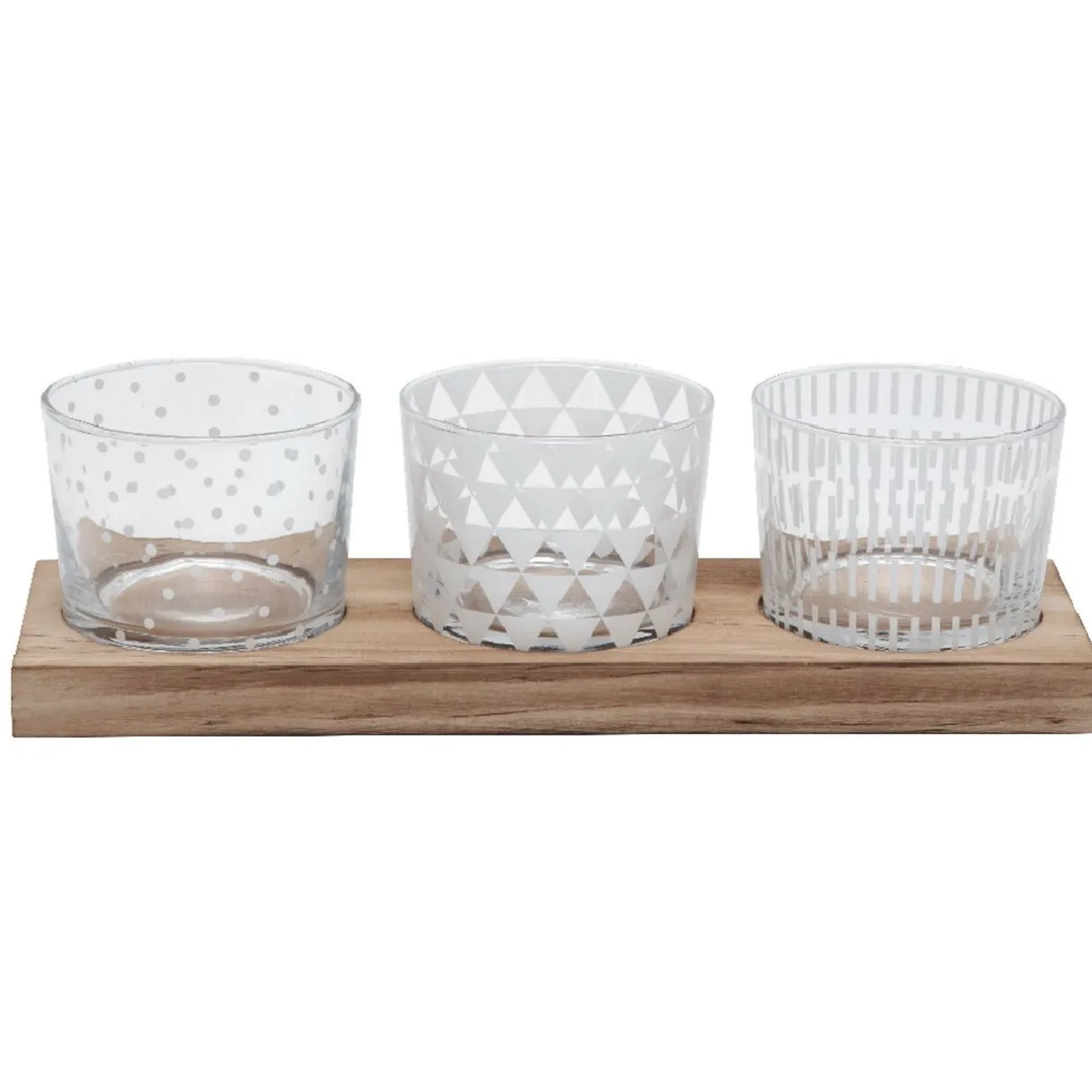 Épatez vos invités avec un service inédit grâce à cette planche en bois et ses 3 coupelles en verre. 3 motifs différents pour encore plus d’originalité. Encastrables dans le support en bois, ces coupelles à pois, à traits et à triangles pourront proposer des gressins, des concombres et une sauce crémeuse au paprika.