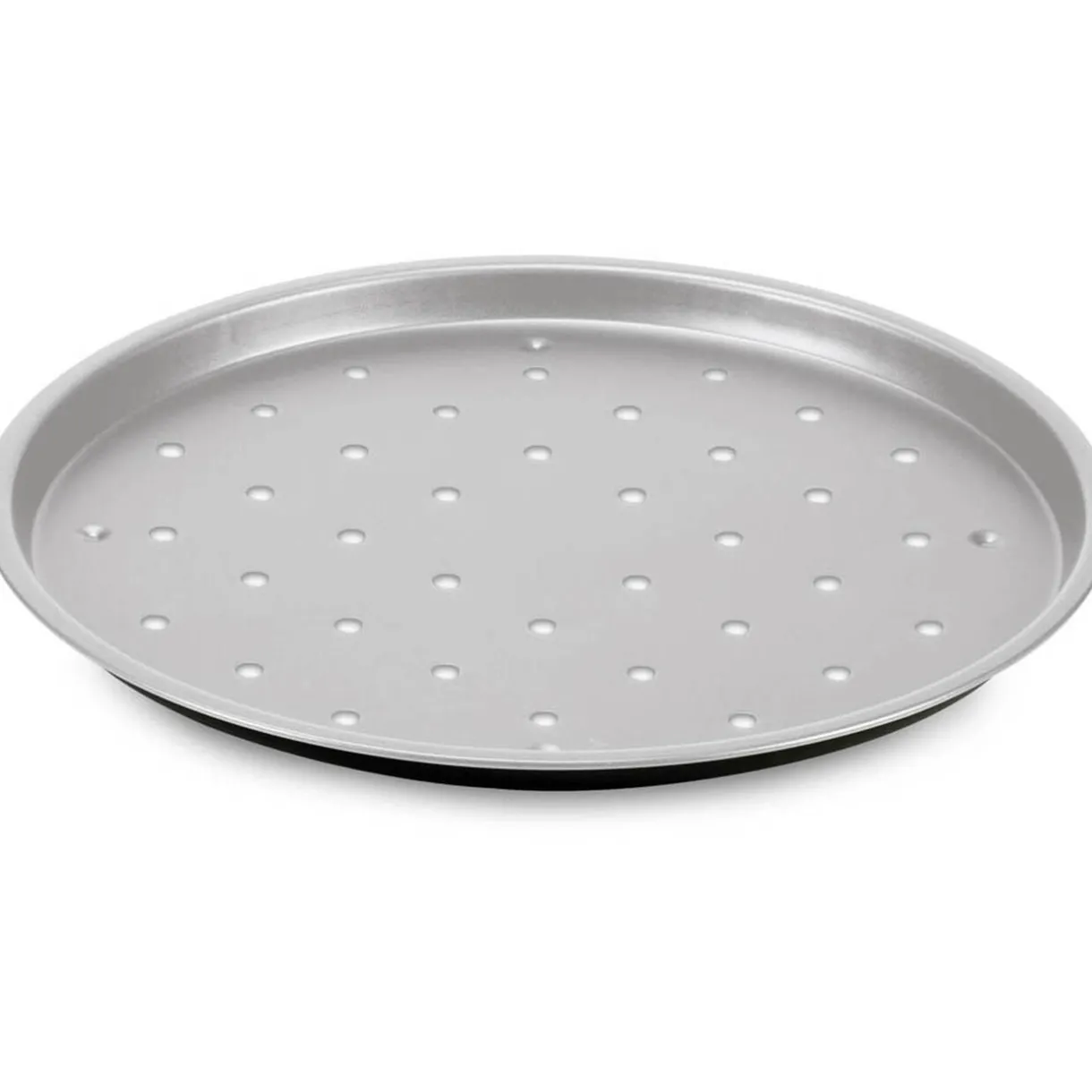 Faîtes cuire vos pizzas sans qu’elles ne collent au plat avec cette plaque ronde en acier anti-adhésif grise et noire.