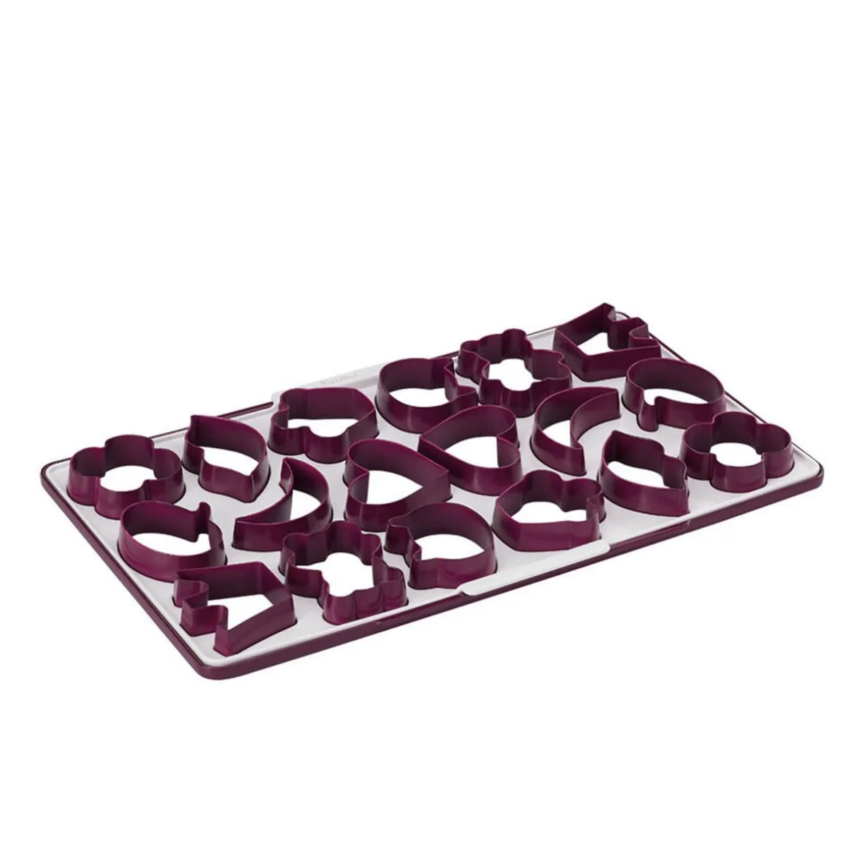 Plaque de 18 emportes pièces de différentes formes : étoiles, gâteau, ourson, couronne, lune, fleur, chat, bulle, coeur, bouche.