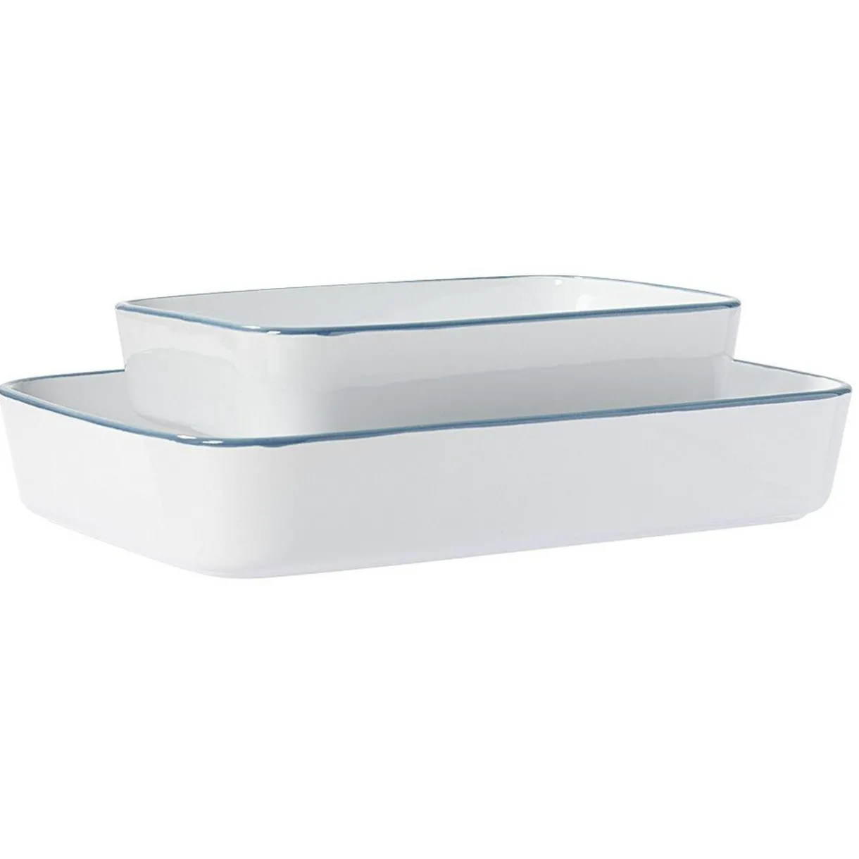 Préparez de délicieux repas à l’aide de ces deux plats rectangulaires blancs avec bordure bleue.
