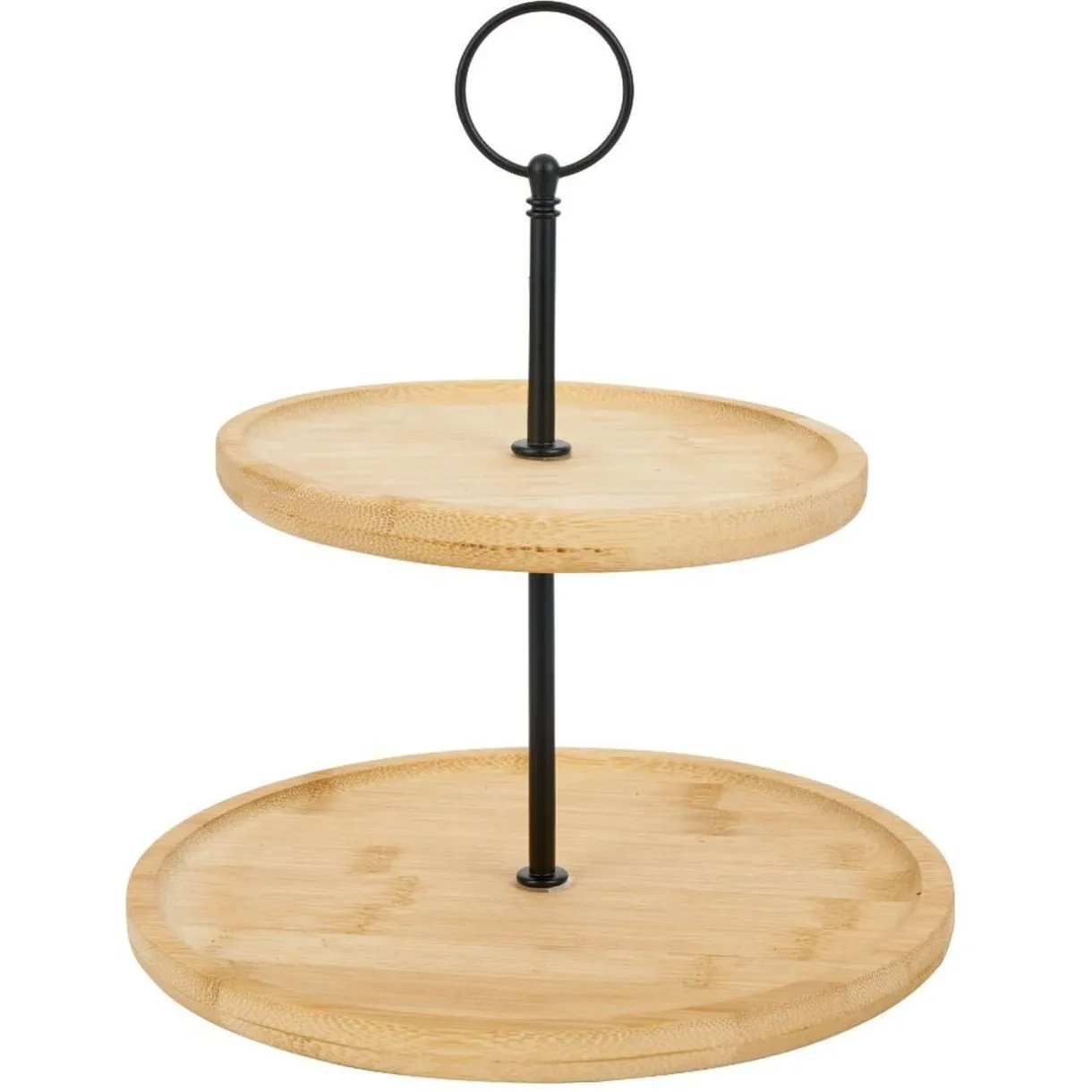 Fabriqué en bambou et fer noir, ce plateau offre un diamètre de 16,5cm et une hauteur de 21,5 cm, parfait pour mettre en valeur vos délicieuses pâtisseries.