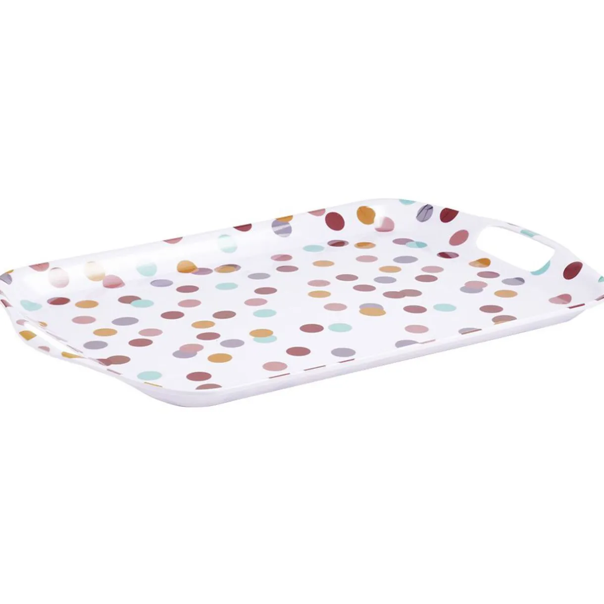 Plateau en plastique mélaminé imprimé pois multicolores.