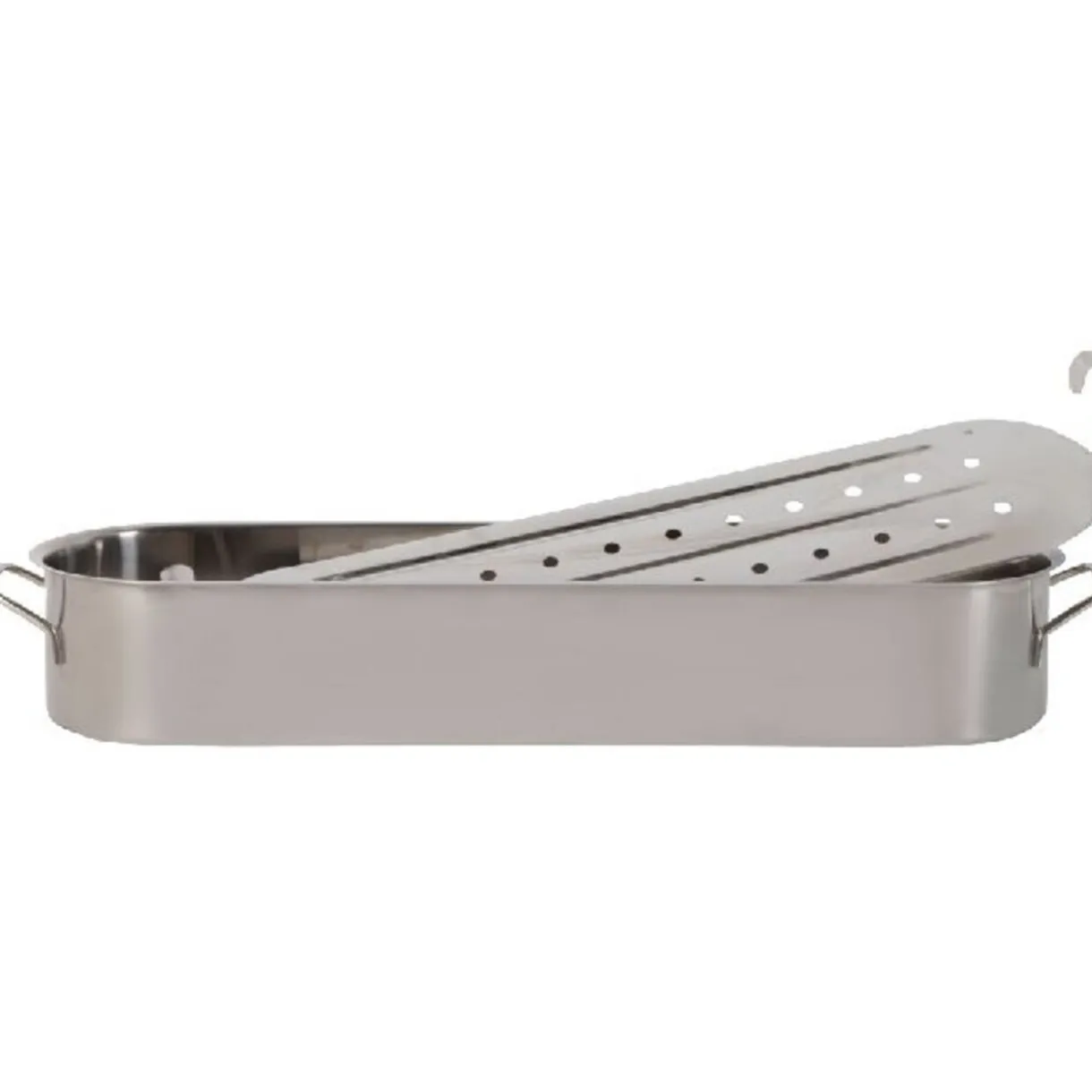 Poissonnière, dim. 61,5x19x10 cm, inox, poignées métal, tous feux même induction, lave vaisselle.
