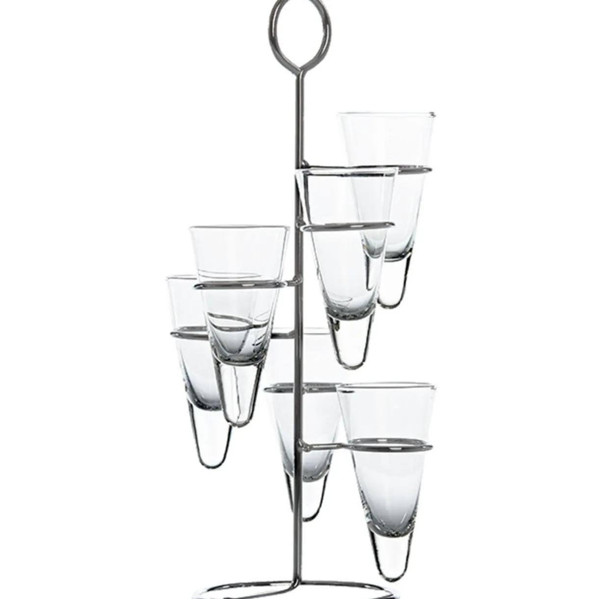 Présentoir en métal h. 33 cm et 6 verrines coniques en verre dim. h.10,5xø5,5 cm.