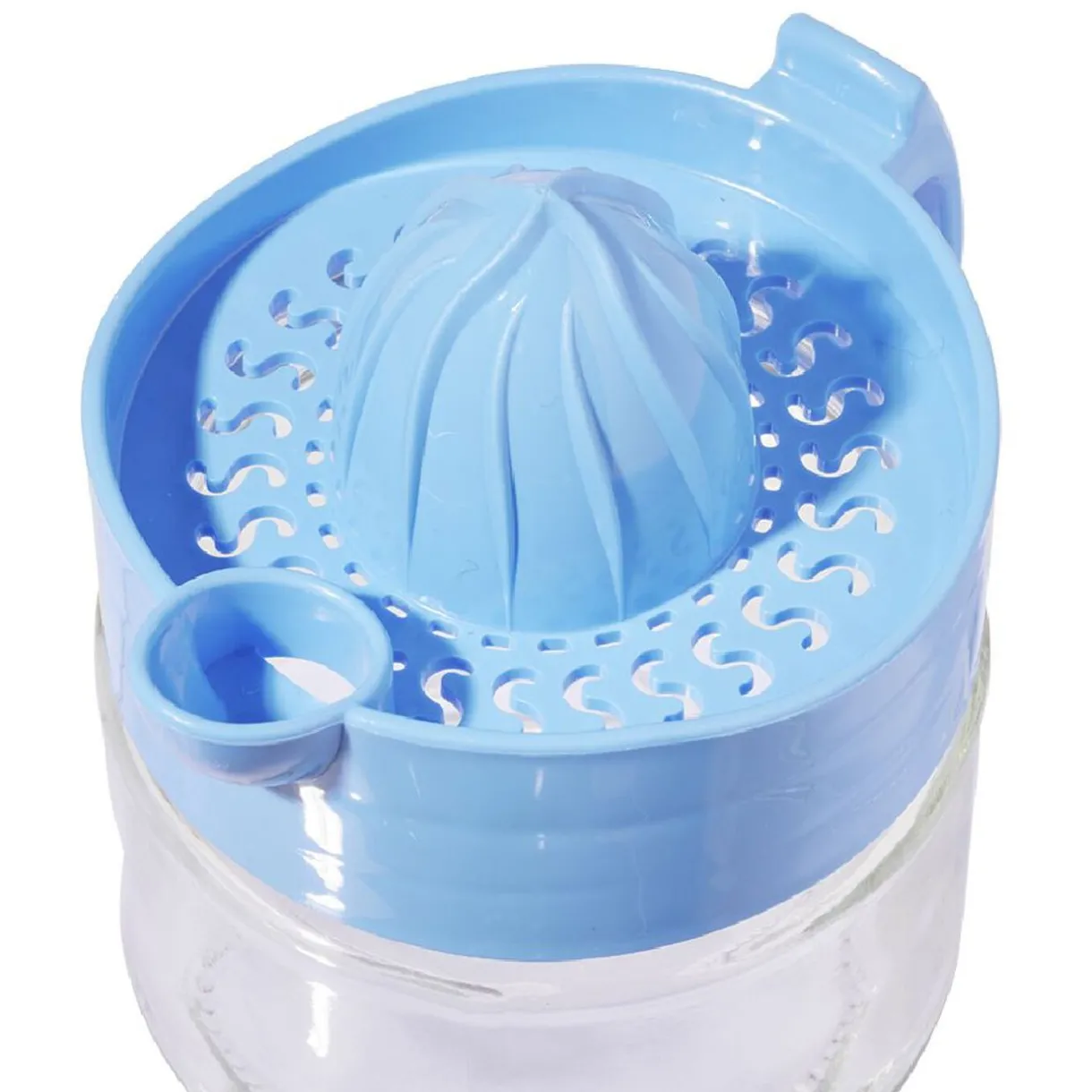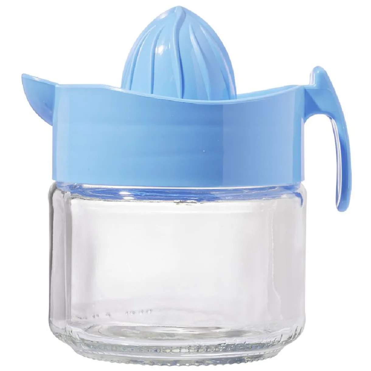 Presse-citron manuel avec bec verseur en plastique et réservoir en verre.