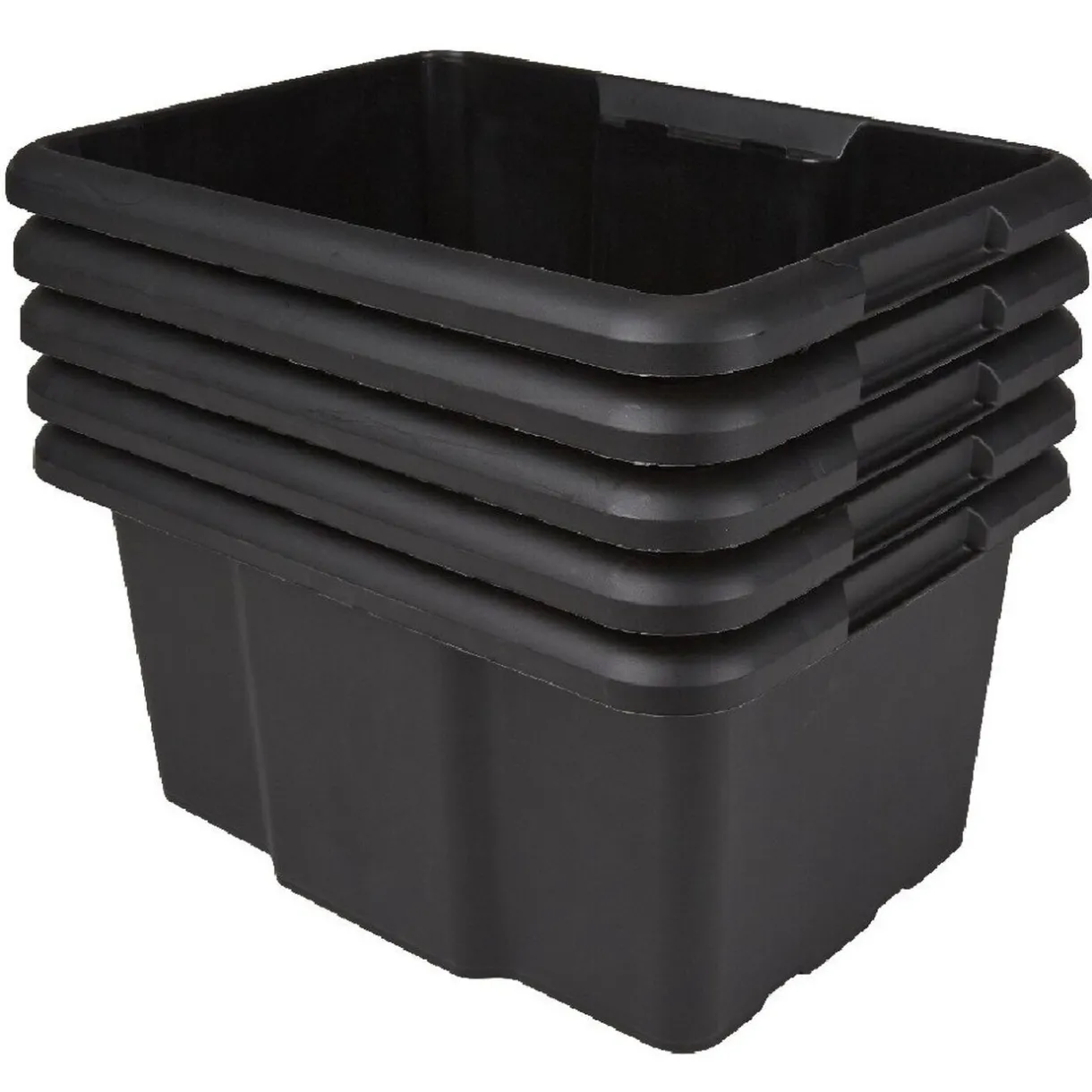 Lot de 5 bacs de rangement d’une contenance de 15L chacun en plastique noir.