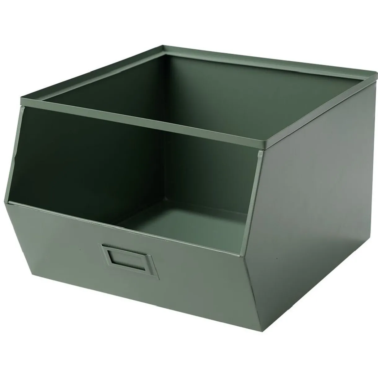Bac de rangement superposable en métal vert, idéal pour organiser votre intérieur dans un esprit rétro.