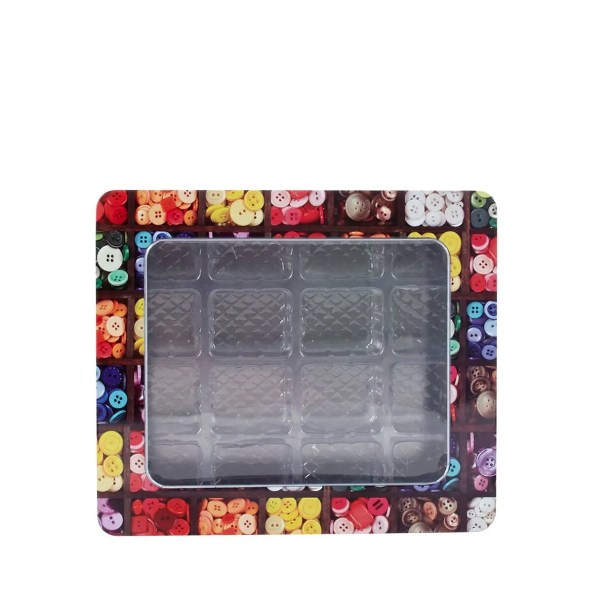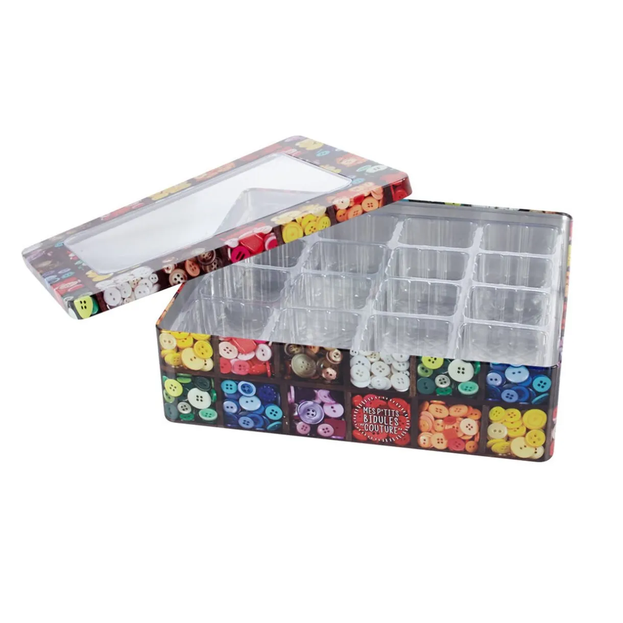 Boîte de rangement pour boutons de couture, 16 compartiments, dim. 25x7x21,5 cm, métal.