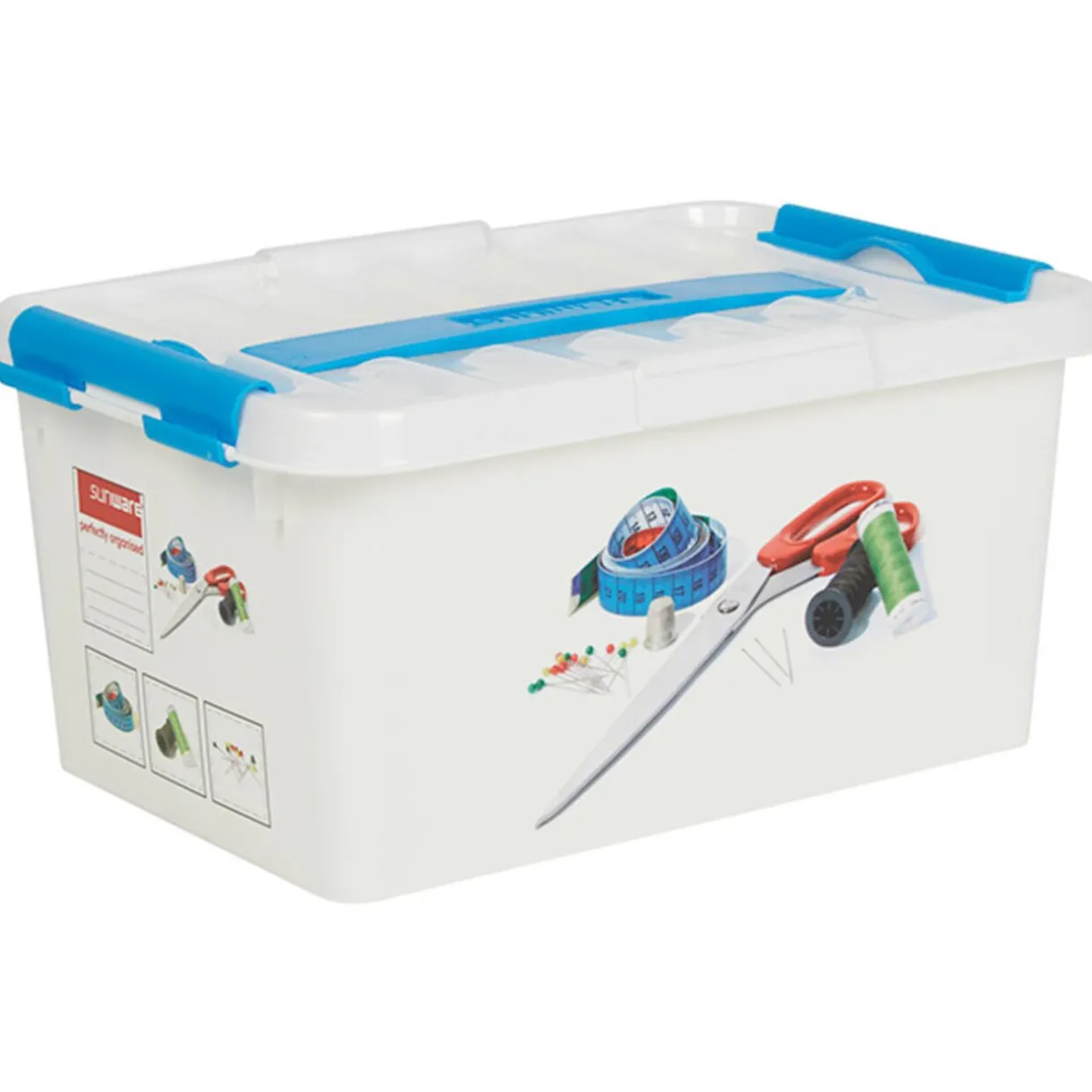 Boîte de rangement spécial couture 6 L, dim. 30x20x14 cm, plastique. Nombreux compartiments, poignée et fermeture par clip.