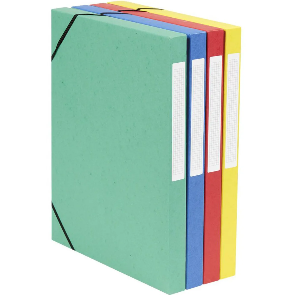 Optimisez le rangement de vos papiers à l’aide de ces 4 boîtes de rangement de couleur jaune, rouge, verte et bleue.