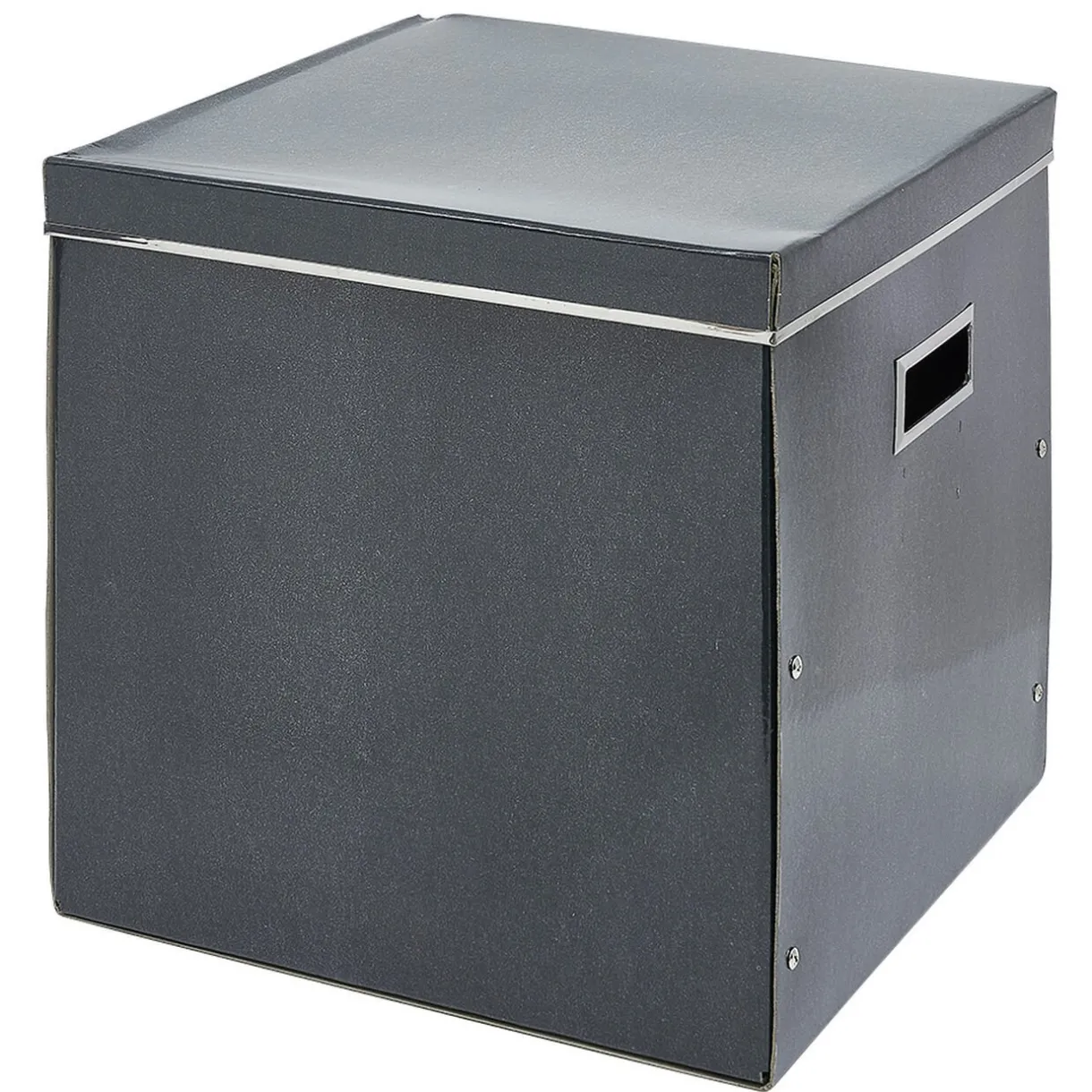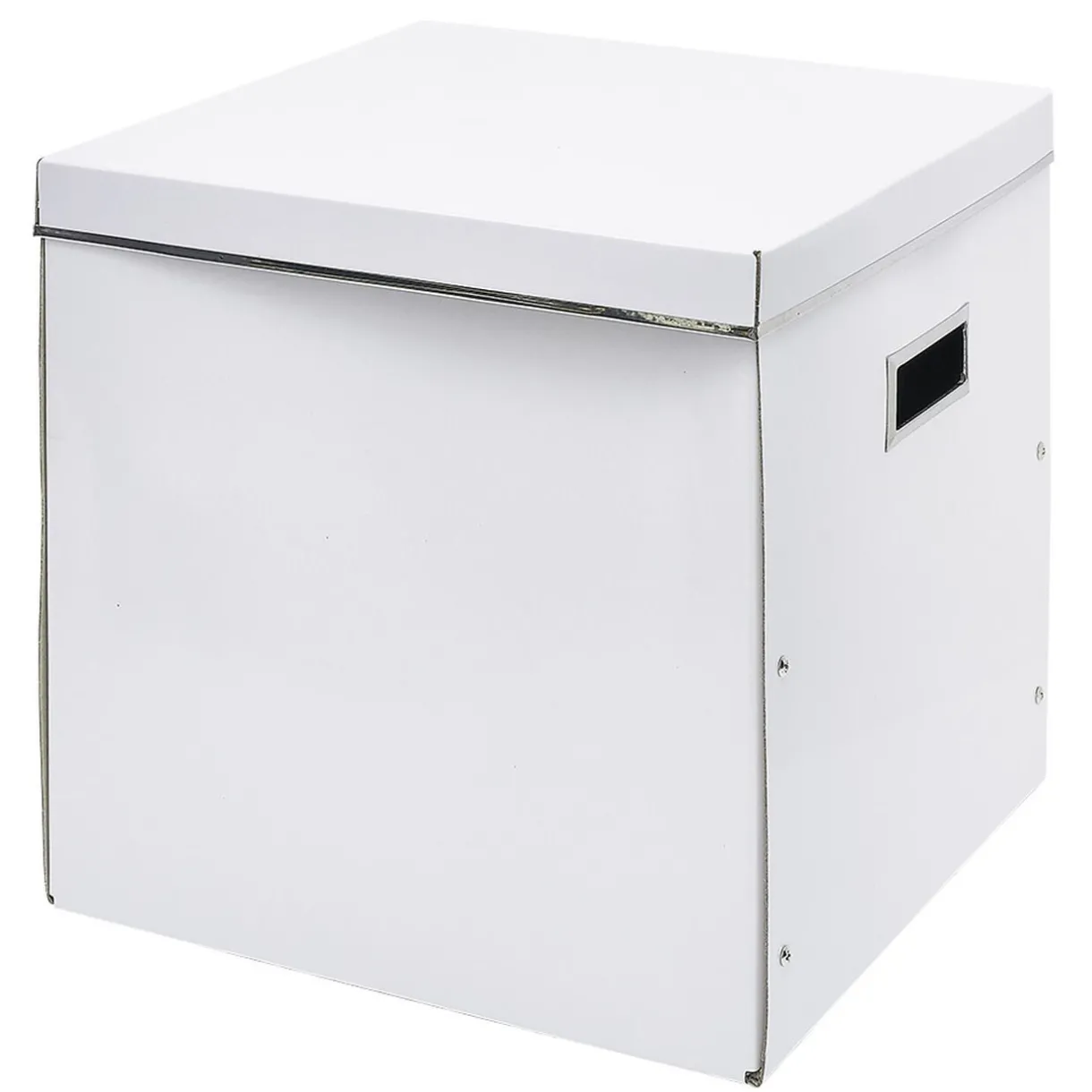 Boîte de rangement avec couvercle en carton uni avec renfort en métal et emplacement pour indiquer le contenu.