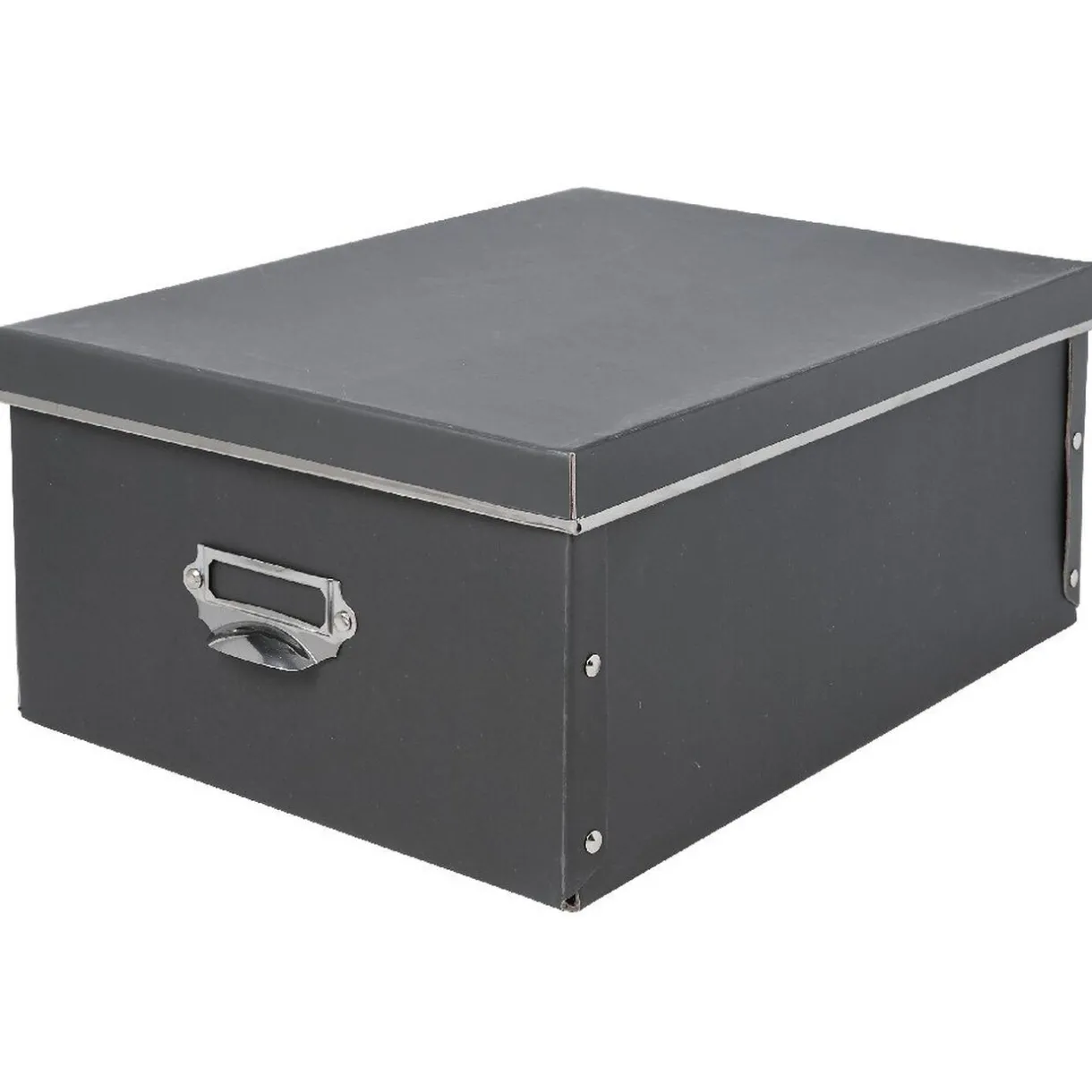 Boîte de rangement en carton gris anthracite avec couvercle et poignée en métal pour faciliter le transport.