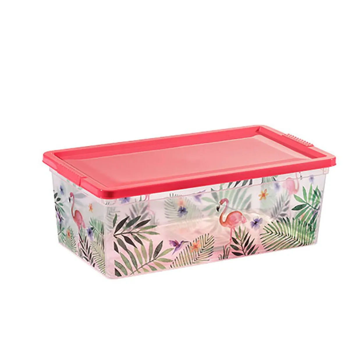 Boîte de rangement avec couvercle en plastique multicolore imprimée de flamant rose, feuilles de palmier, oiseau et fleurs.