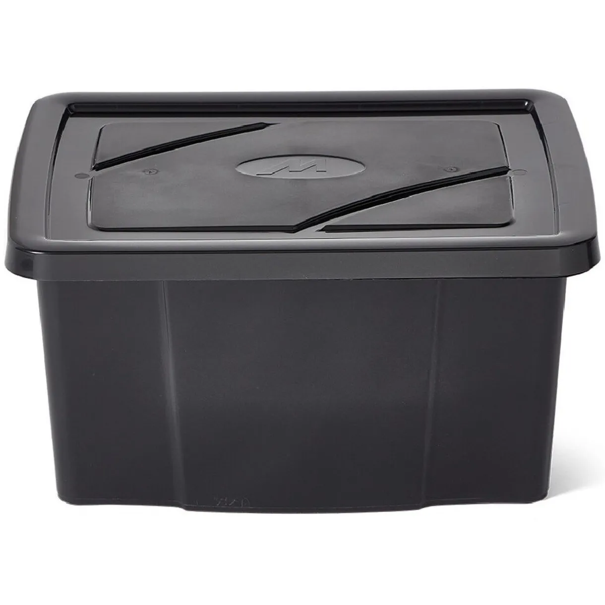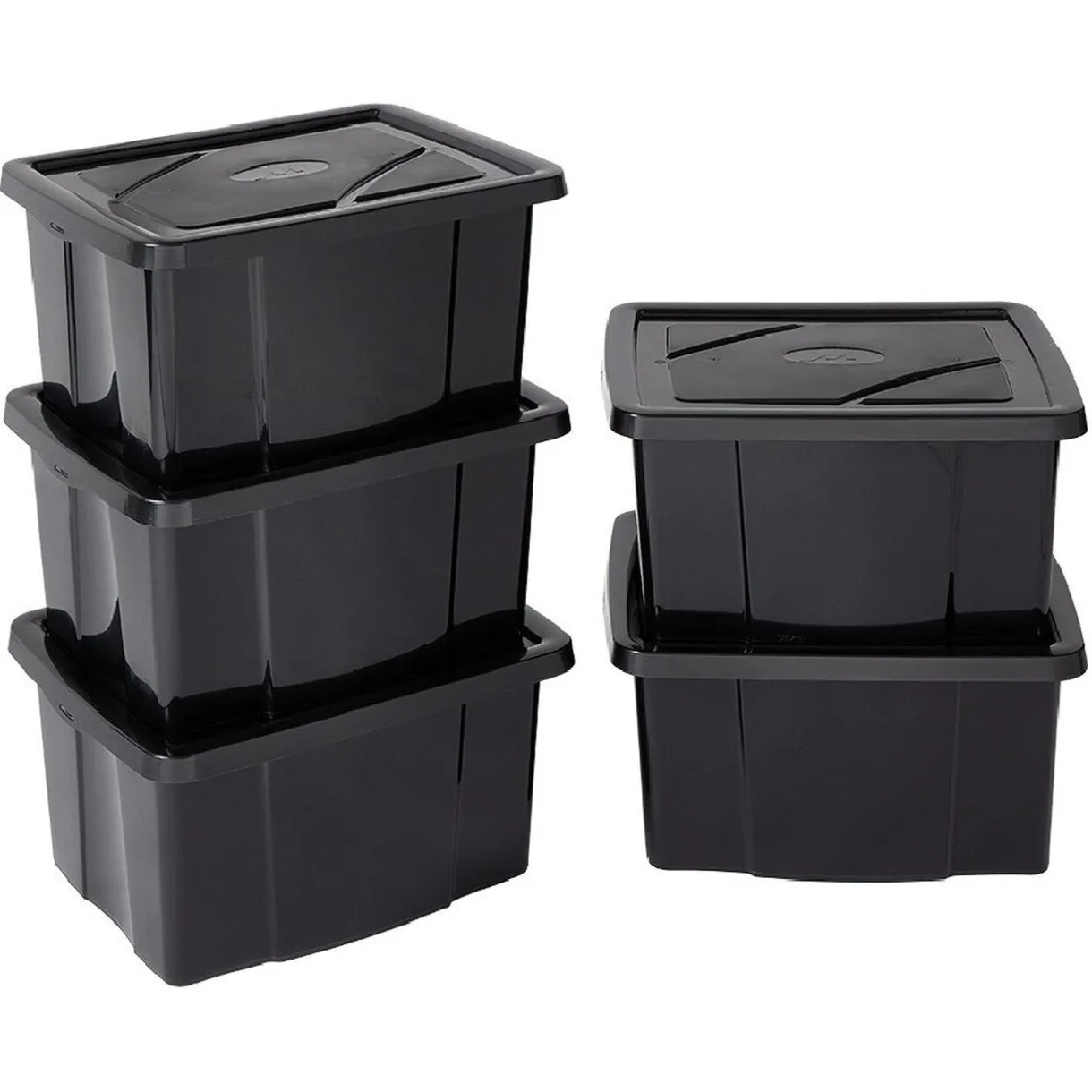 Lot de 5 boîtes de rangement en plastique noir d’une contenance de 30 L chacune. Toutes les boîtes sont munies d’un couvercle pour protéger vos affaires de la poussière et des éclaboussures.