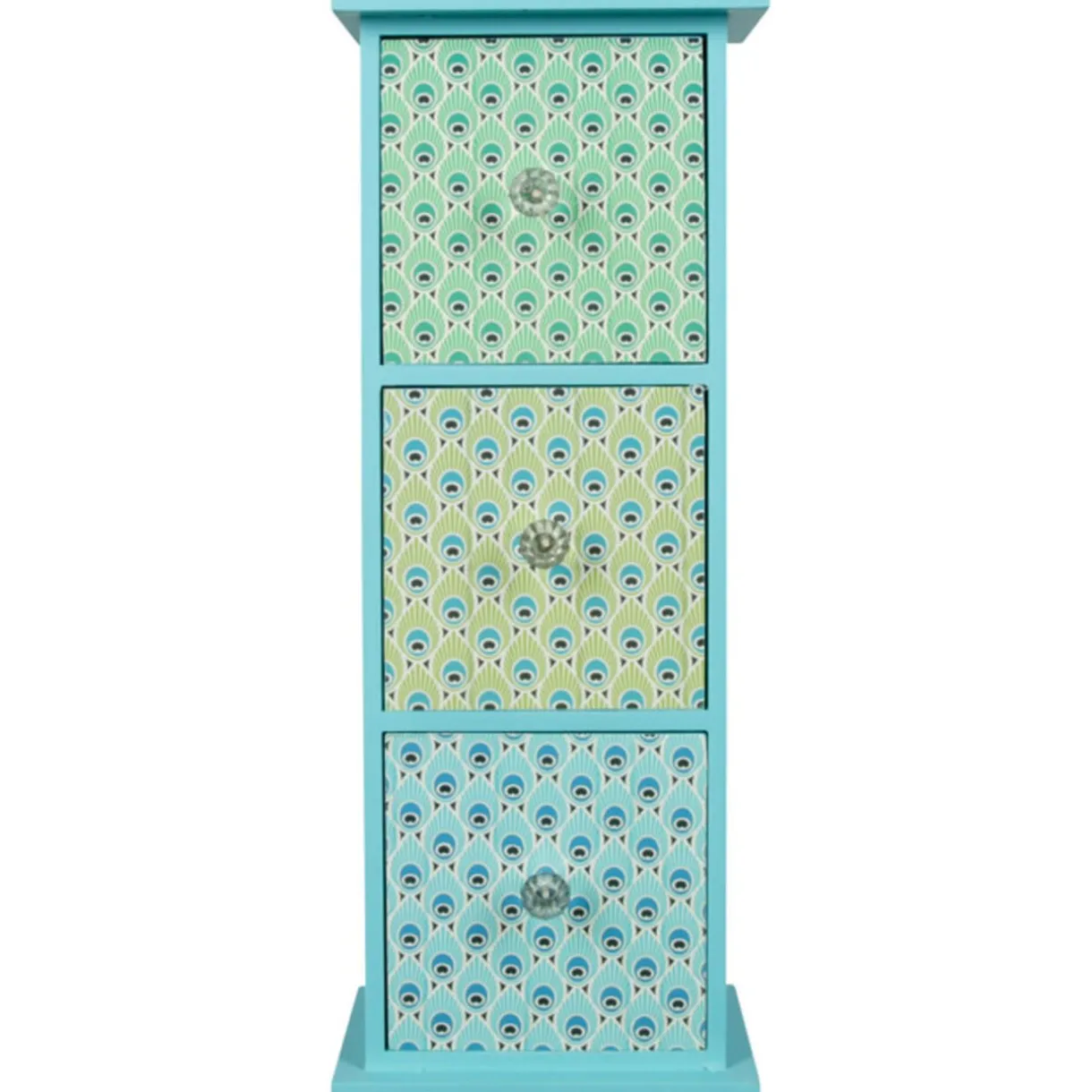 Boîte déco bleu motifs paon 3 tiroirs, MDF (panneau de fibres de bois). Dim. 13×9,8×35 cm.