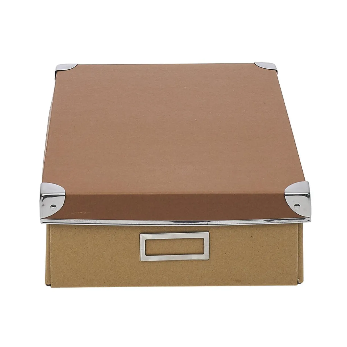 Lot de 3 boîtes gigognes en carton avec renfort en métal sur le couvercle et emplacement pour indiquer le contenu de la boîte.