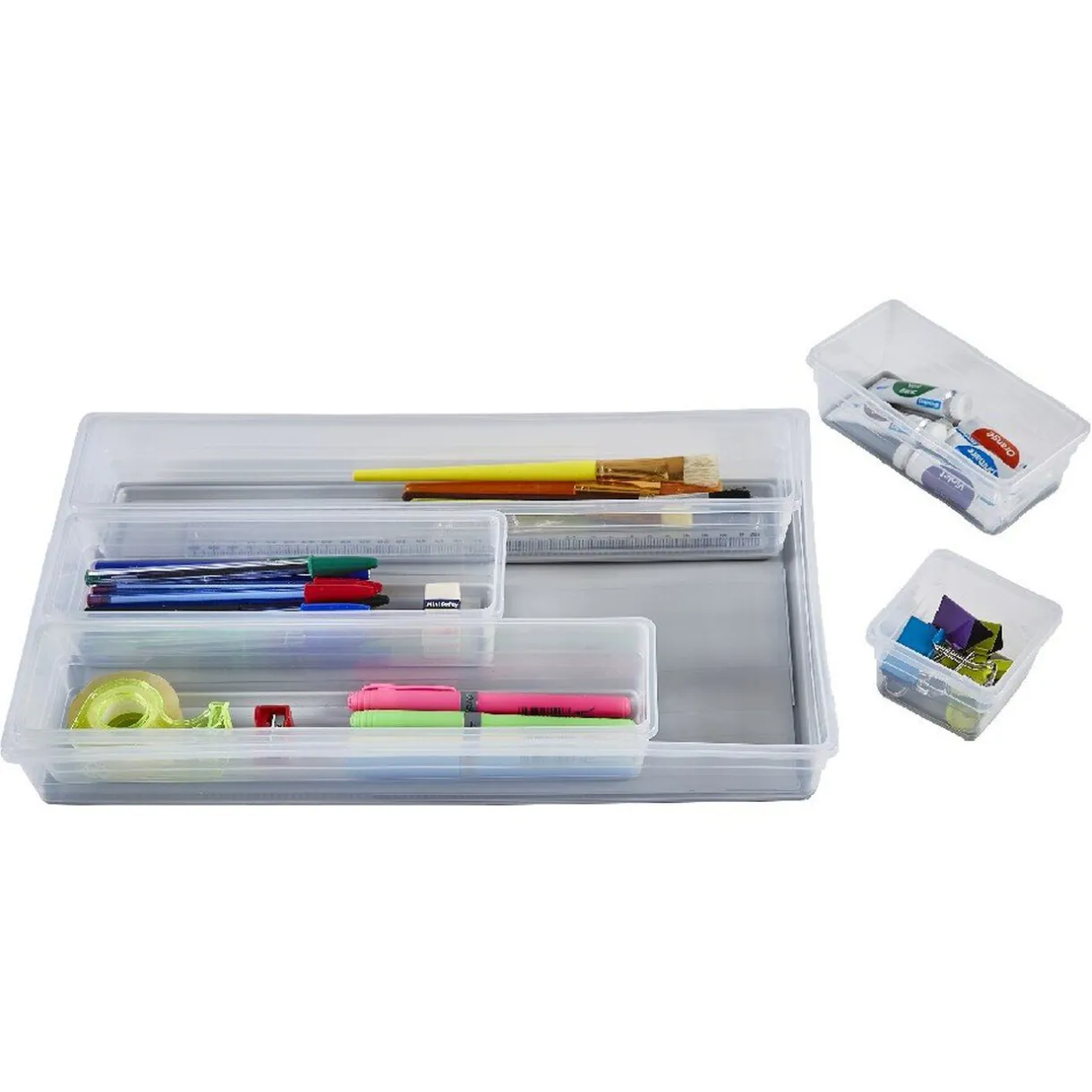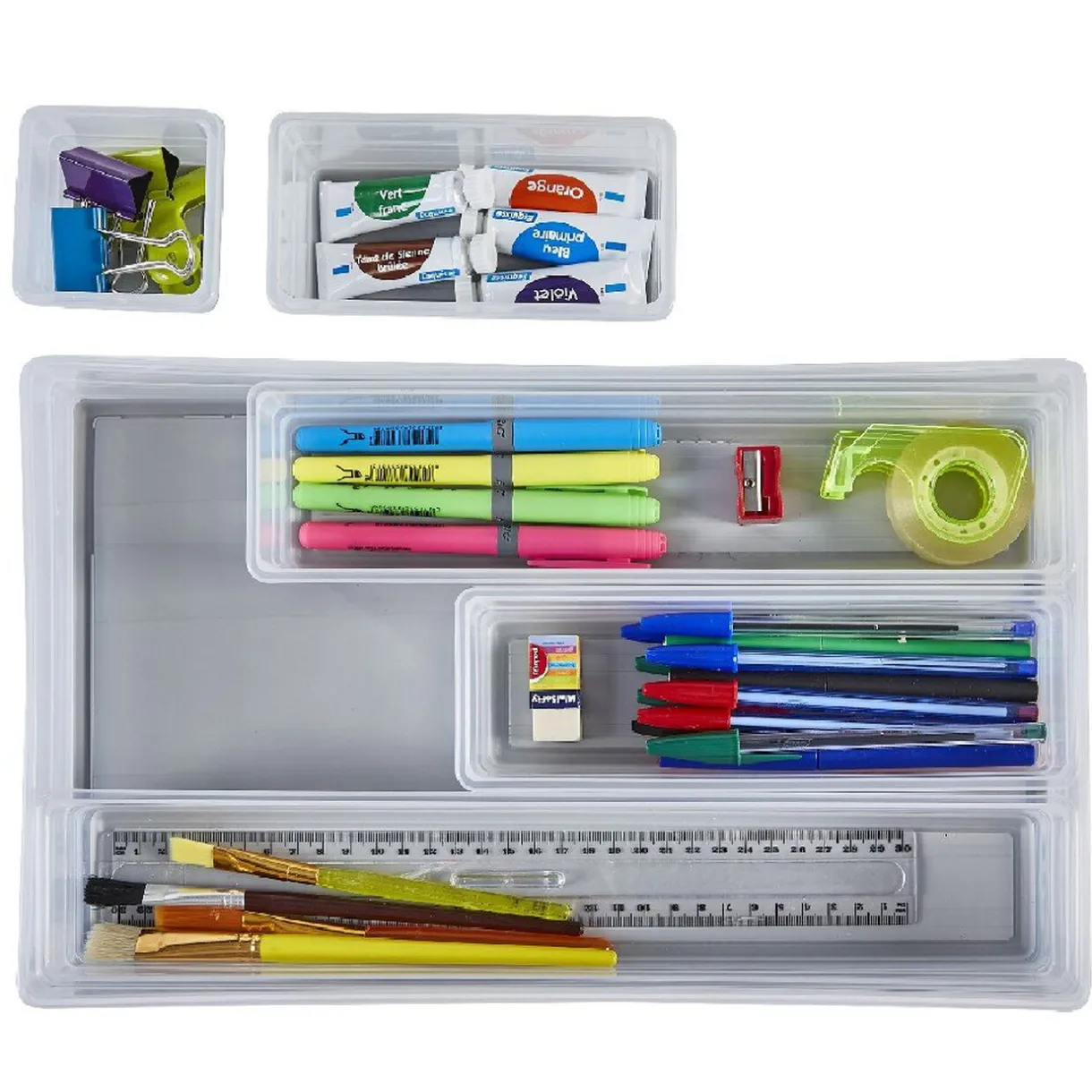 Boîte organisateur de tiroir composée de 6 compartiments en plastique gris transparent. Idéal pour garder vos fournitures et accessoires bien rangé à l’intérieur d’un tiroir ou sur le bureau.