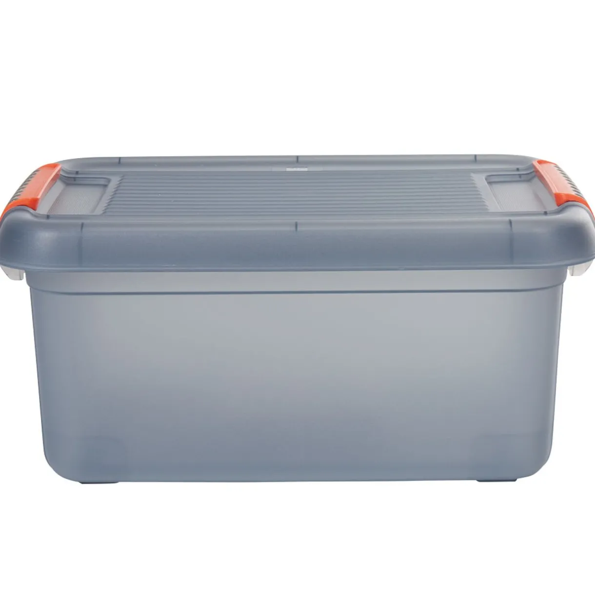 Box de rangement gris bleu d’une contenance de 18 litres, idéal pour un garage, avec clips de fermeture oranges.
