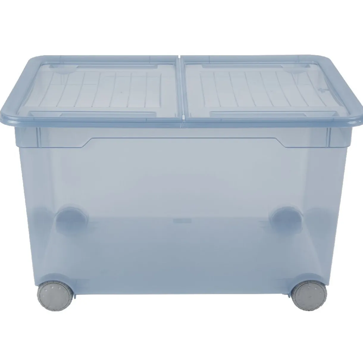 Box de rangement en plastique uni bleu doté de 4 roulettes et d’un couvercle à ouverture fractionnable.