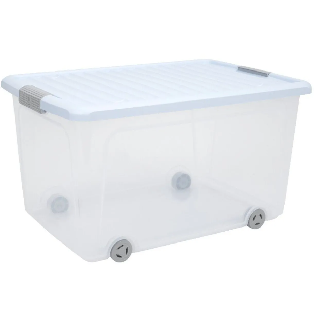 Box de rangement à roulettes transparent avec couvercle bleu.